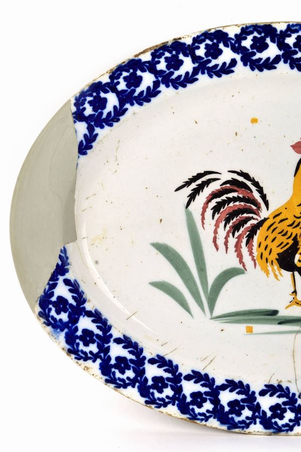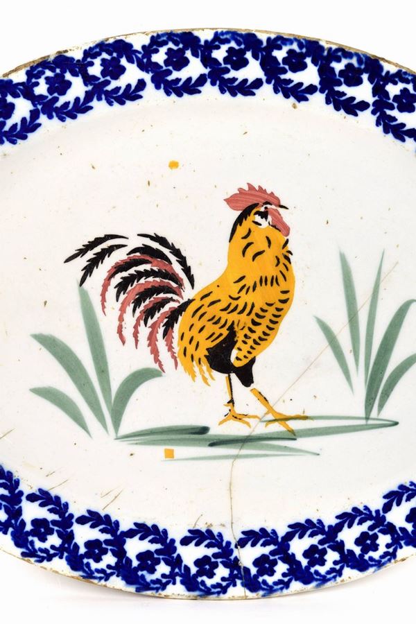 Piatto ovale con galletto dipinto a "stampino" al centro, tesa decorata a ghirlande blu.