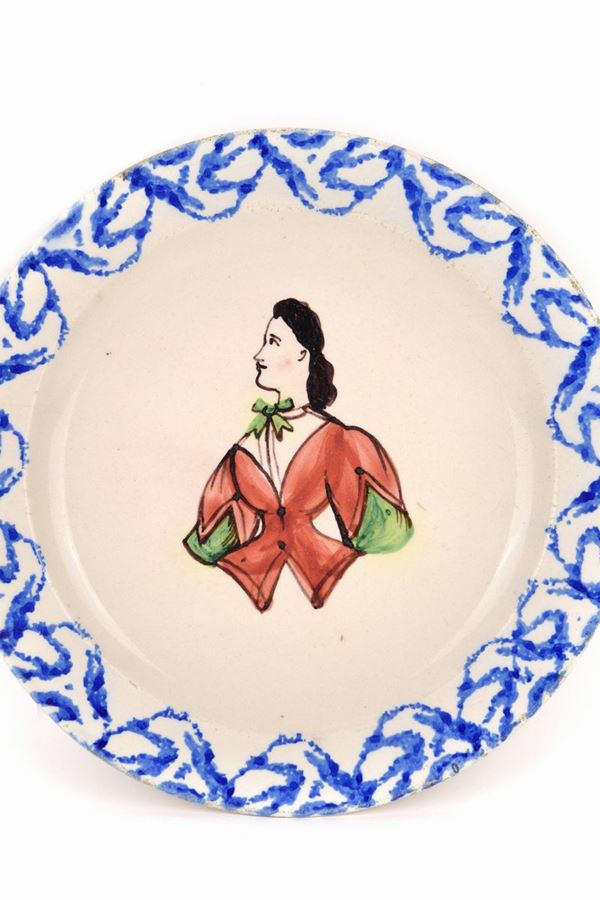 Piatto in maiolica policroma dipinta con busto di donna al centro e decorazione a stampino lungo il bordo.