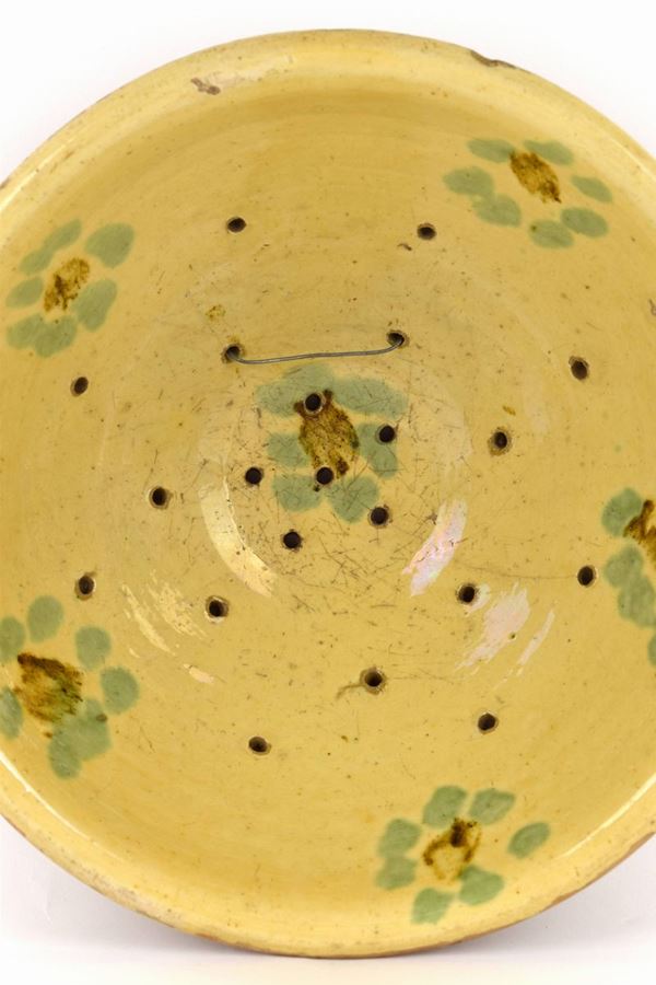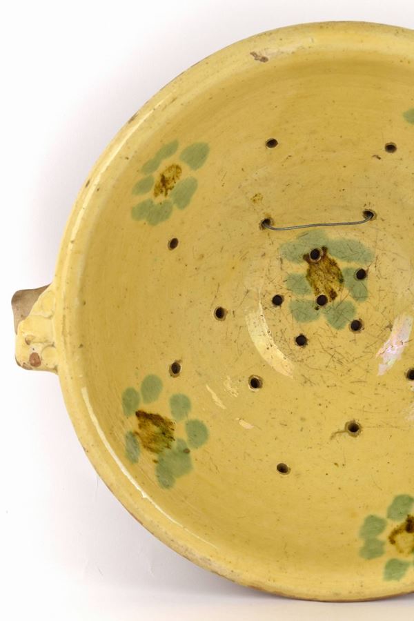 Scolapasta tondo in terracotta smaltata a due manici, con fiori dipinti.