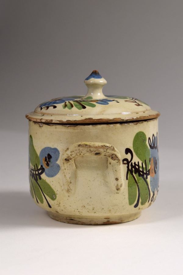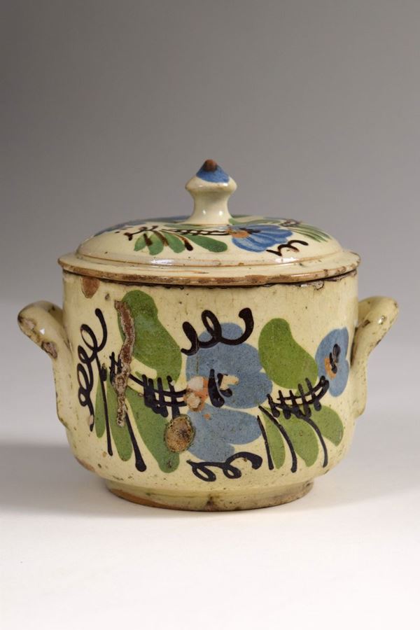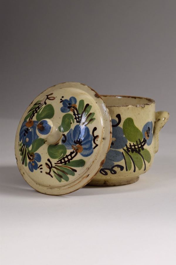Zuppiera in maiolica dipinta a grandi fiori policromi nel corpo e nel coperchio nei colori del verde, azzurro e bruno. Pomellino a goccia e manici sporgenti ad anello.