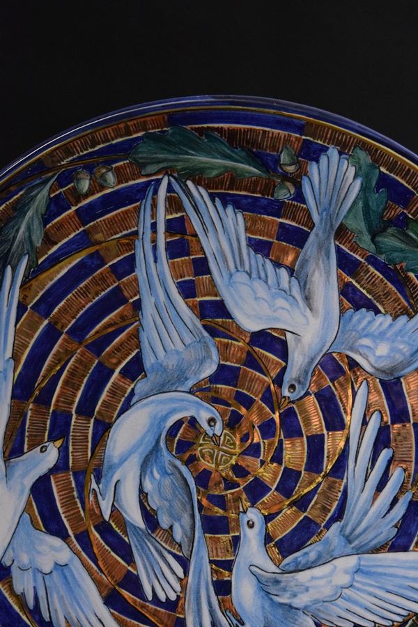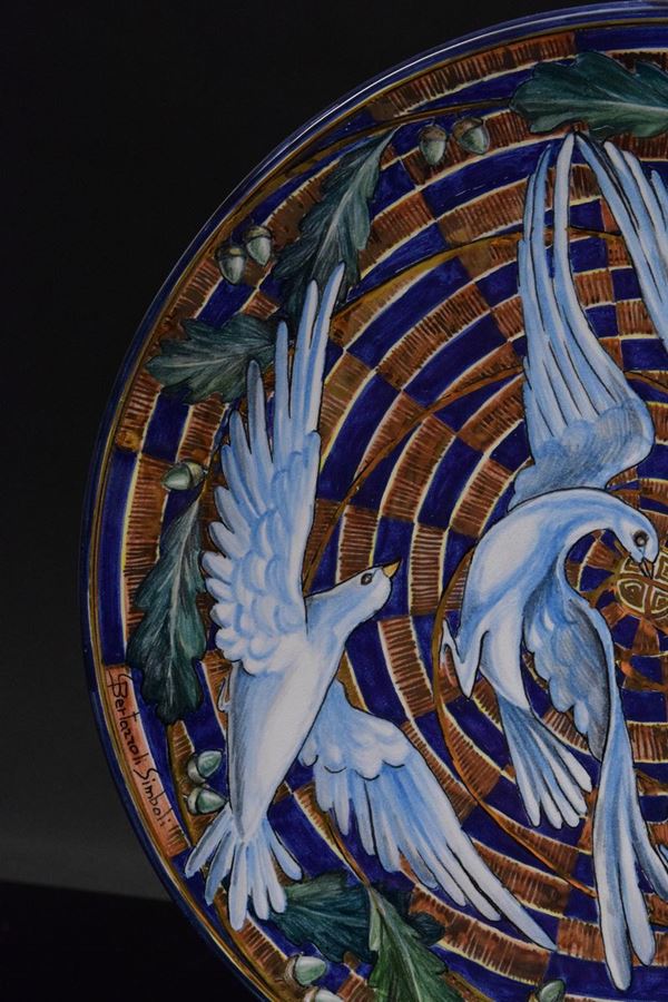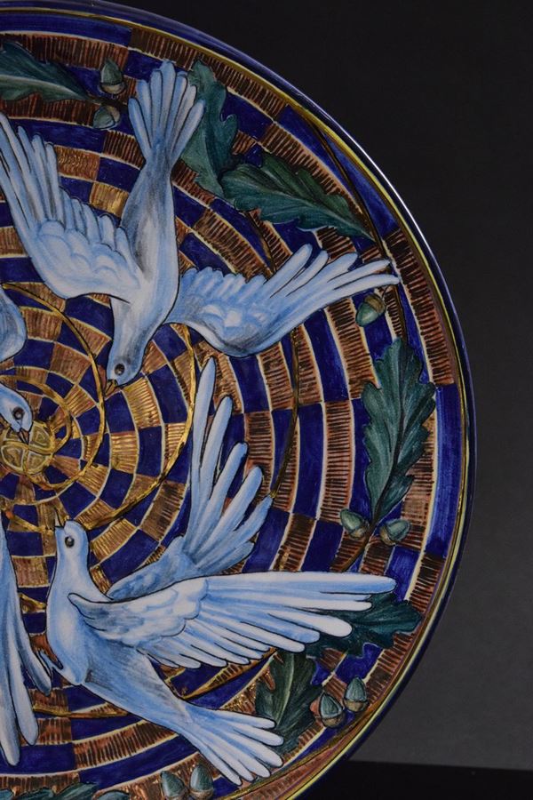 Grande piatto in ceramica policroma dipinta a mano con voli di colombe.