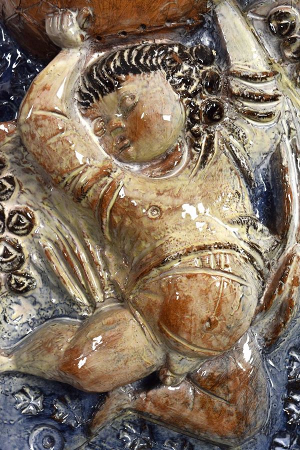 Ceramica policroma ad alto rilievo raffigurante angelo danzante con grandi ali che sorregge una coppa sulla testa.