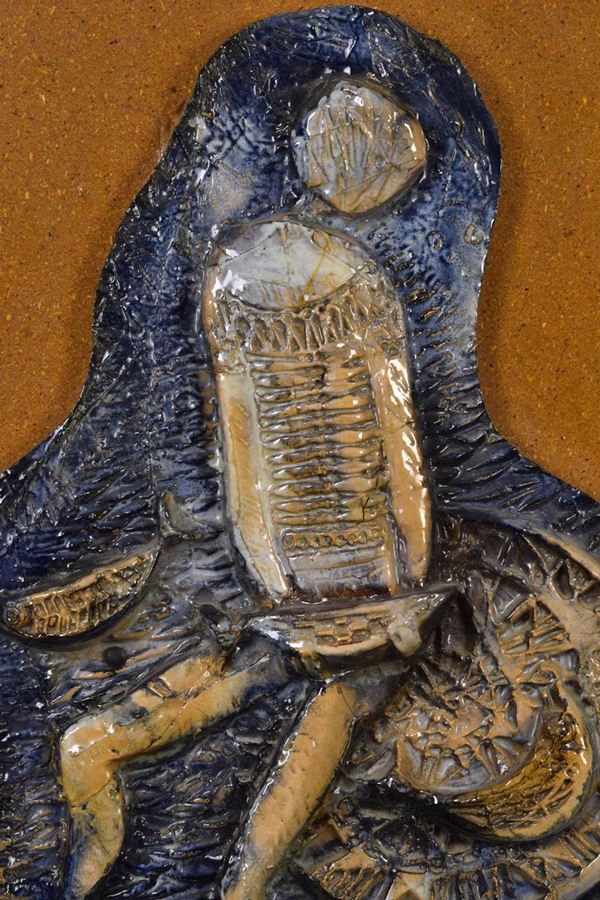 Ceramica policroma a bassorilievo raffigurante miracolo dei pesci. Montato su pannello di faesite coevo.