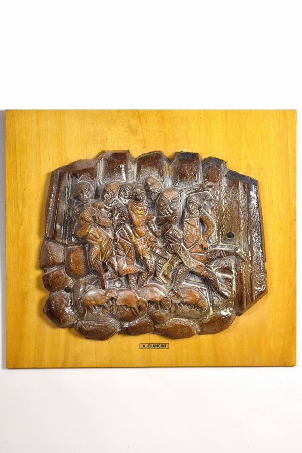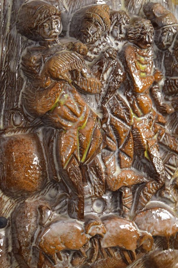 Pannello in ceramica policroma ad altorilievo con gruppo di pastori danzanti. Montato su pannello di faesite coevo.