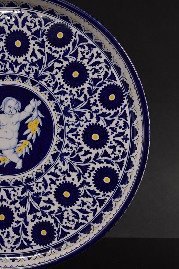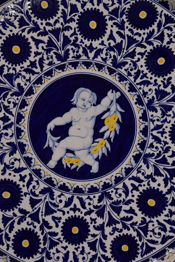 Grande piatto da parata a bordo rialzato in ceramica policroma dipinta a mano con putto e ghirlanda al centro e decoro alla porcellana. .