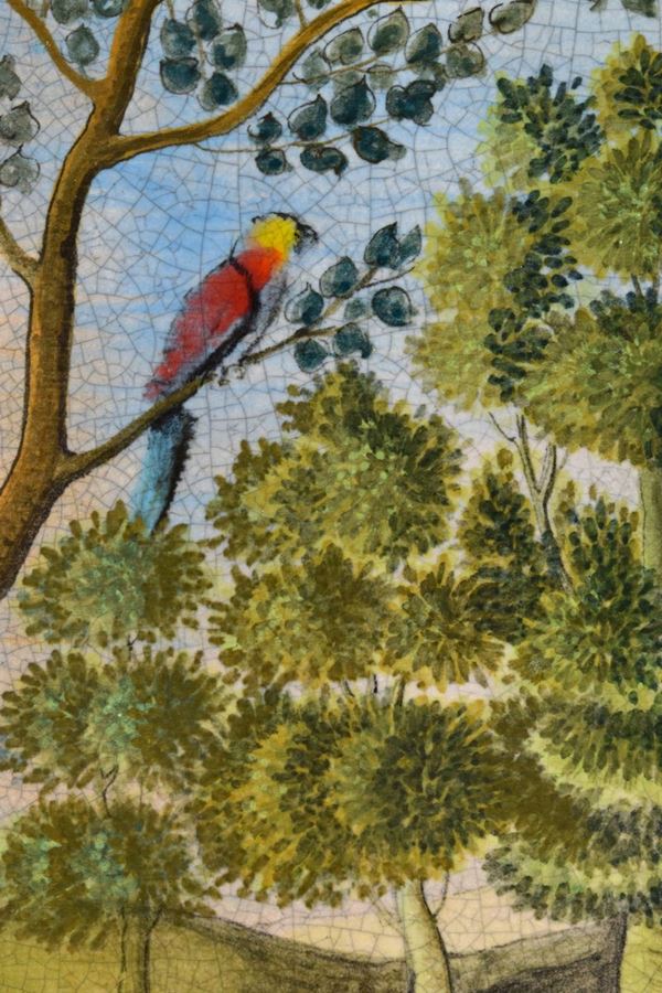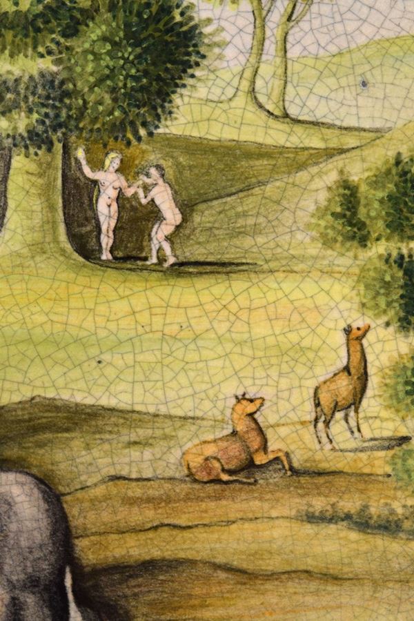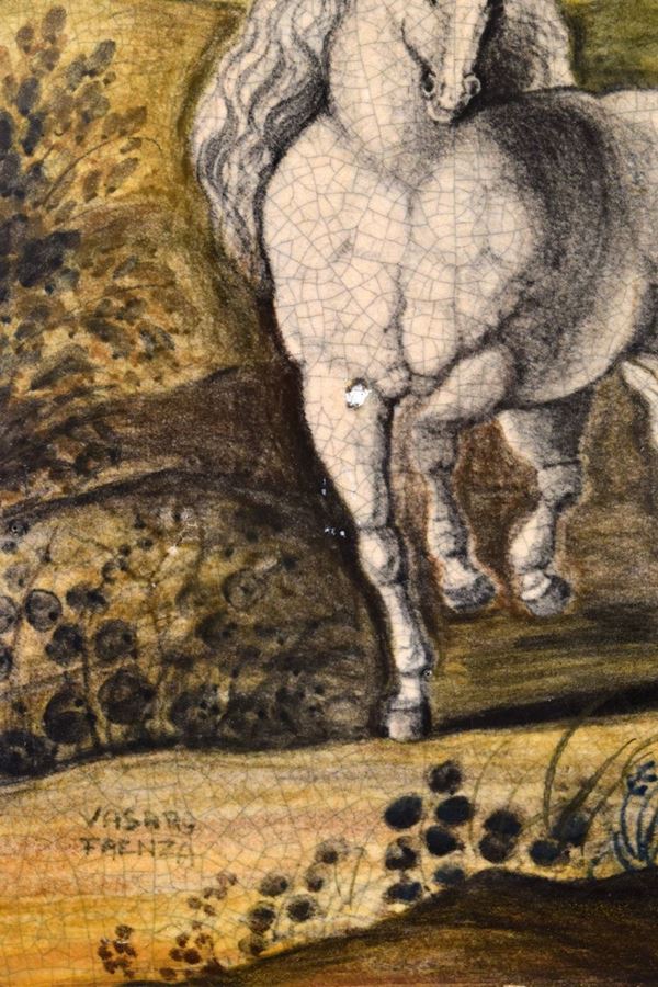 Pannello in ceramica policroma dipinta dall'artista faentino Fernando Babini raffigurante il Paradiso terreste con in primo piano un cavallo bianco di ispirazione dechirichana, sullo sfondo Adamo ed Eva.