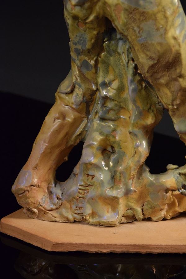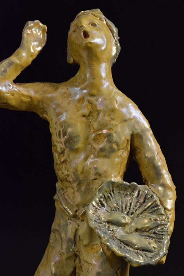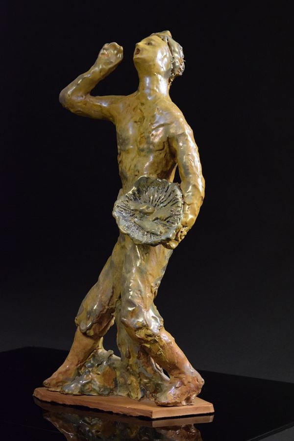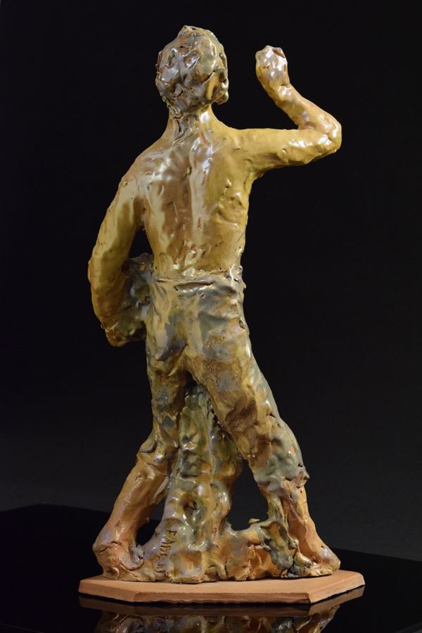 Scultura di pescivendolo in ceramica policroma riflessata a tutto tondo. Su base in terracotta patinata.