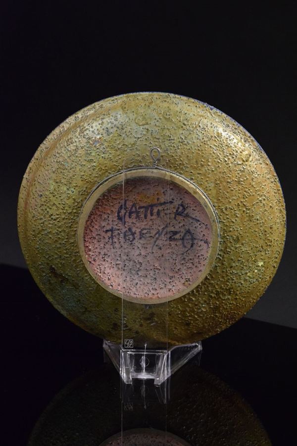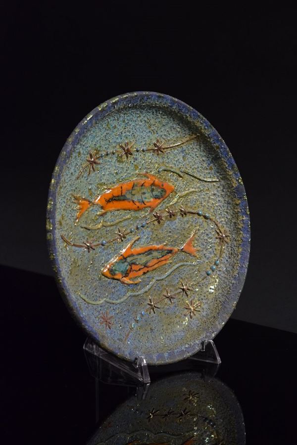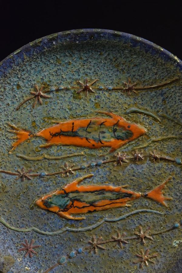 Piatto in ceramica policroma a fondo mat puntinato con segno dei pesci a smalto lucido al centro.