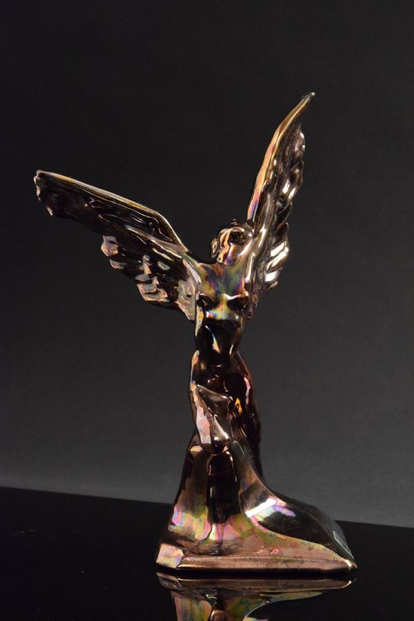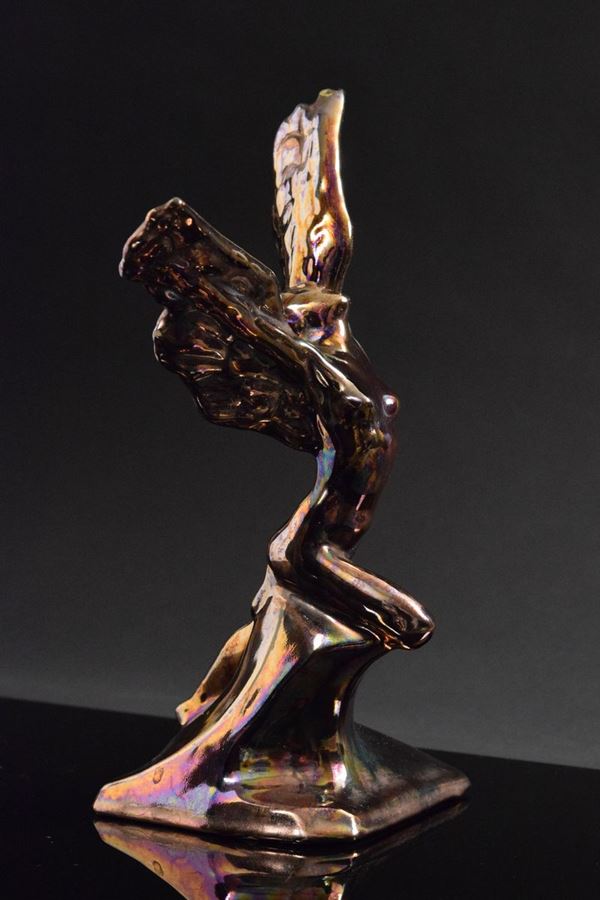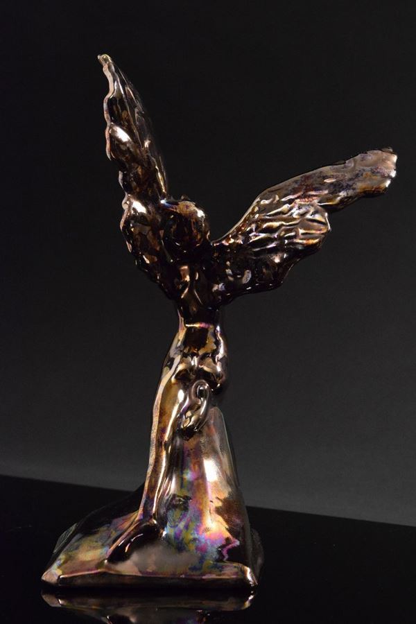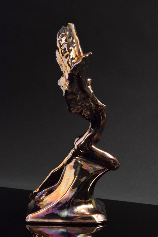 Ceramica monocroma a lustro effetto bronzo, classico dell'artista, di figura femminile con ali.