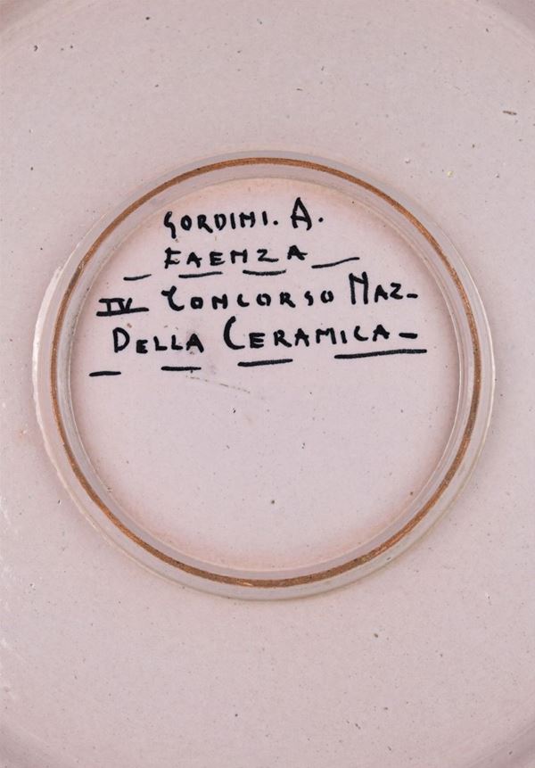 Firmata nel retro "Gordini A. Faenza" e presenta scritta "IV concorso naz della ceramica".