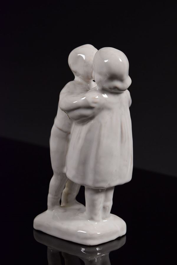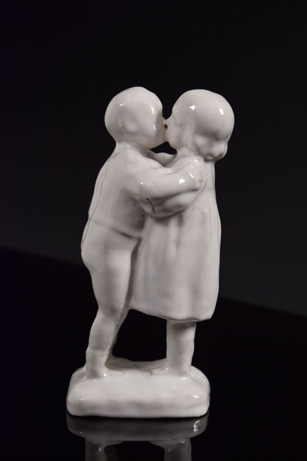 Ceramica monocroma a smalto lucido bianco di coppia di cugini che si baciano, da un modello di Domenico Baccarini del 1903. Difetti.