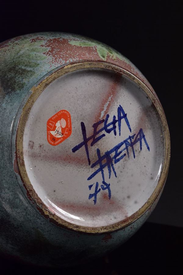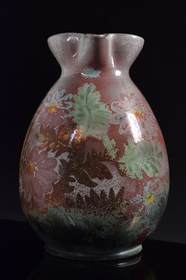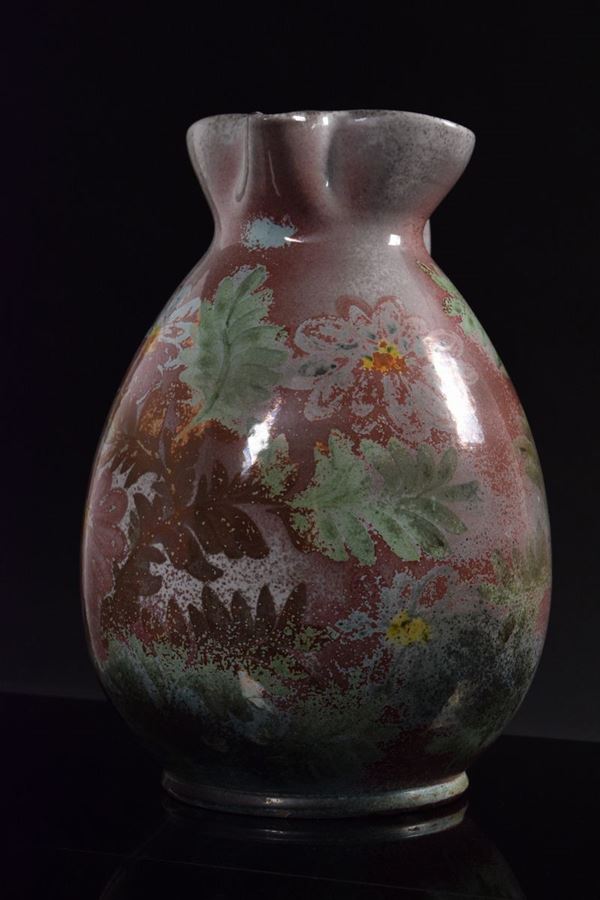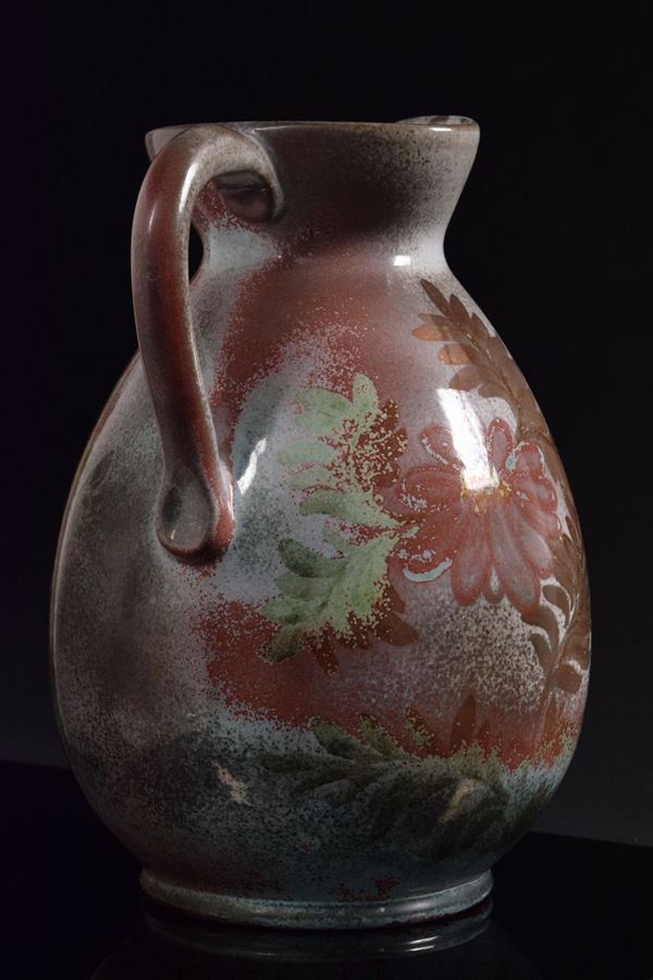 Grande brocca in ceramica policroma a motivi floreali dipinti e riflessata nei classici colori dell'artista.