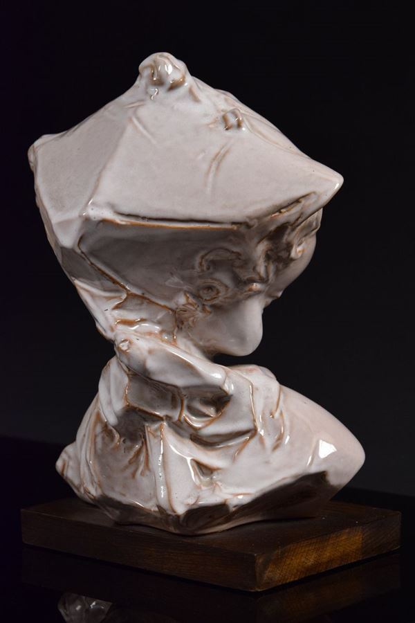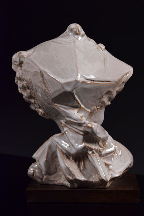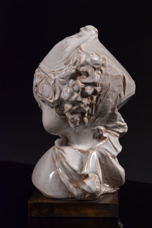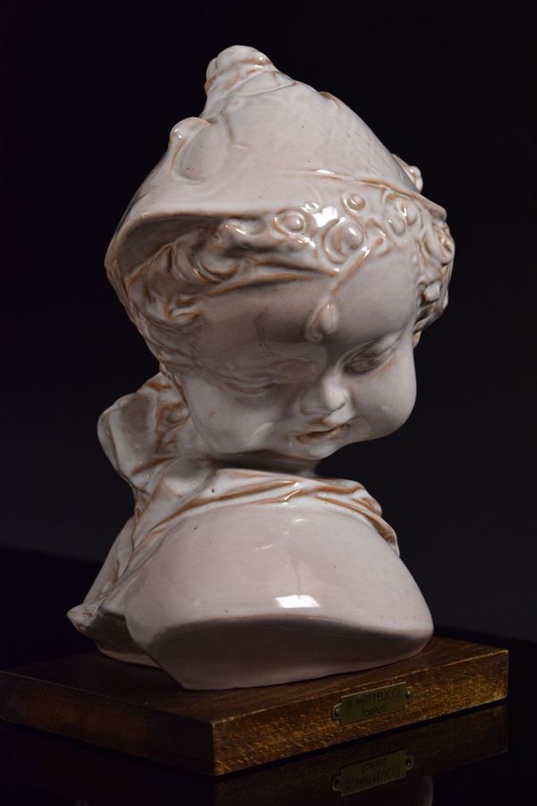Ceramica monocroma a smalto bianco di mezza figura di putto con "goccia" sulla fronte. Base in legno coeva.