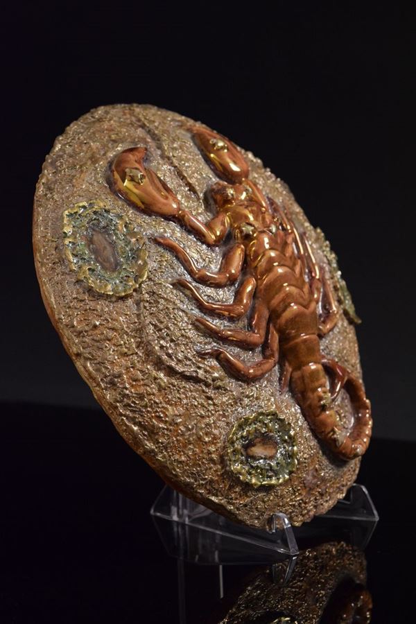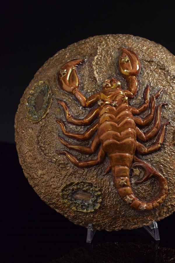 Tondo in ceramica policroma a fondo mat con segno zodiacale dello scorpione applicato a smalto lucido.