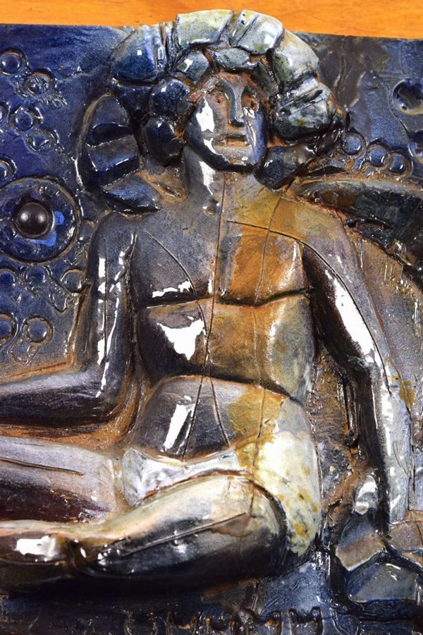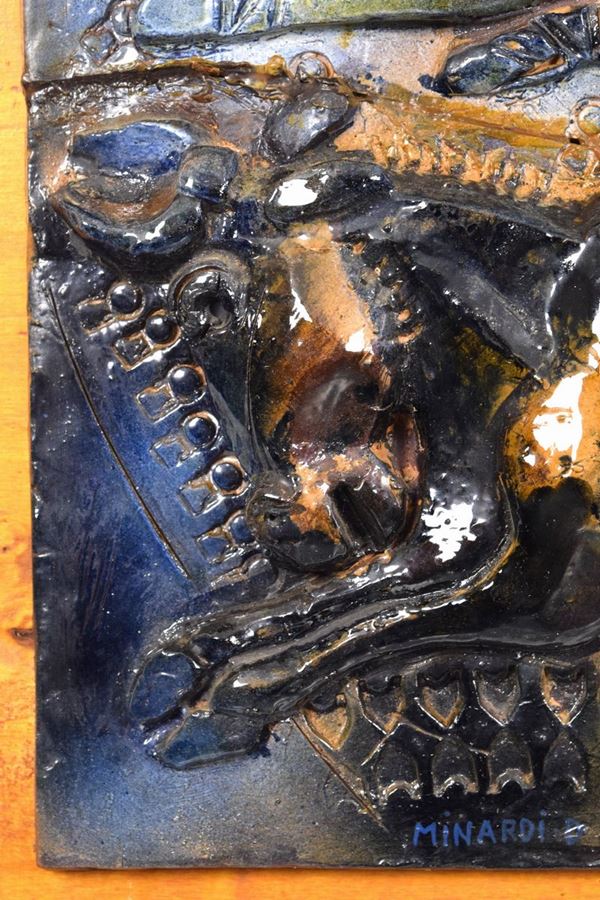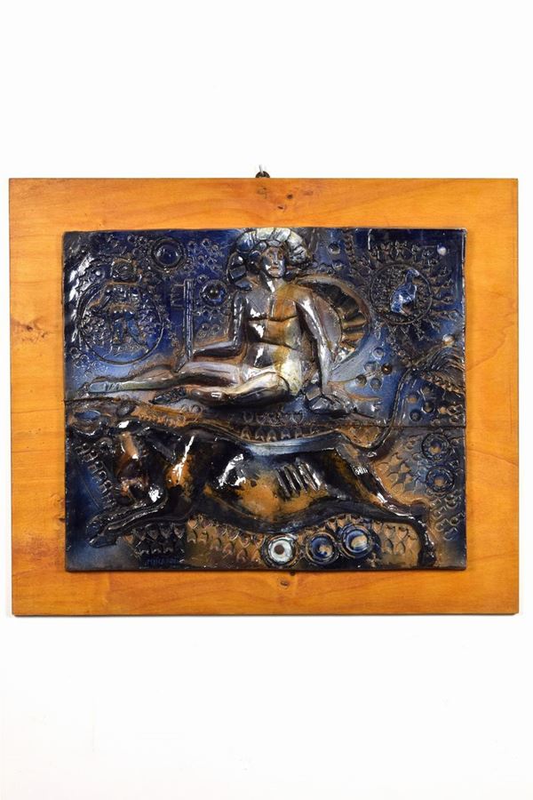 Pannello ad altorilievo in ceramica policroma raffigurante i segno dello zodiaco. Montato su pannello in legno.