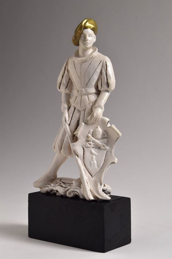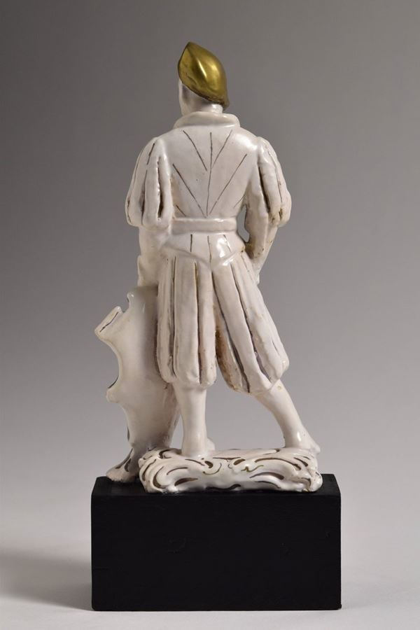 Figura a tutto tondo in ceramica monocroma smaltata bianca semi-lucida con particolari in oro.
