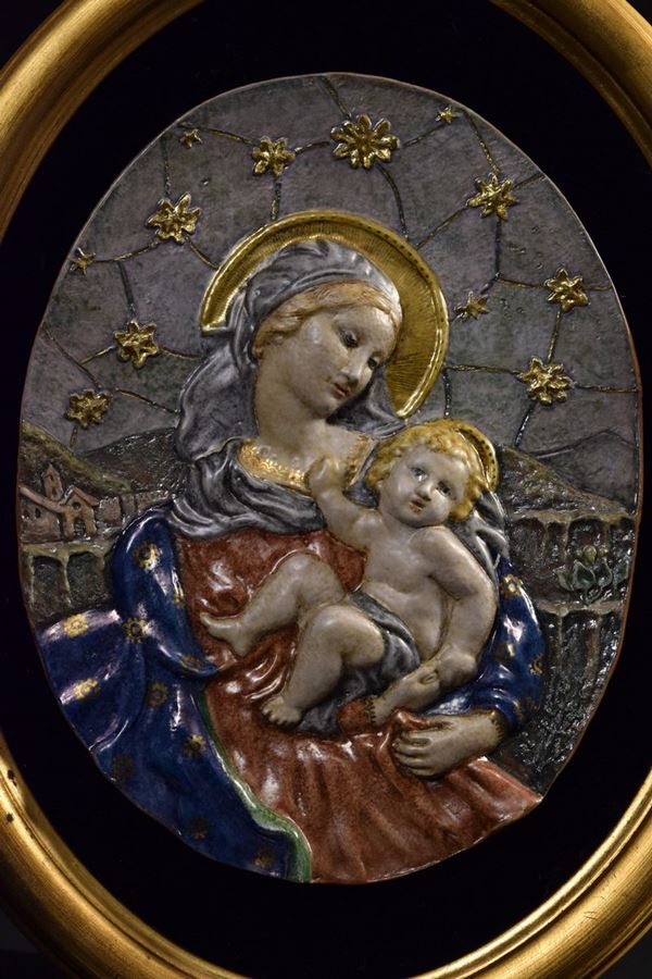 Ovale in ceramica policroma a bassorilievo di Madonna con Bambino, paesaggio sullo sfondo.