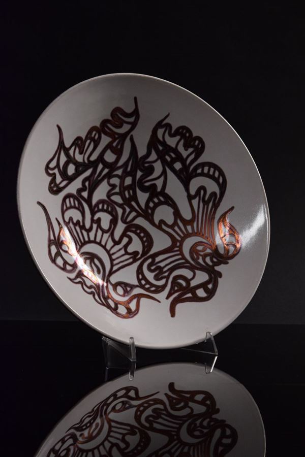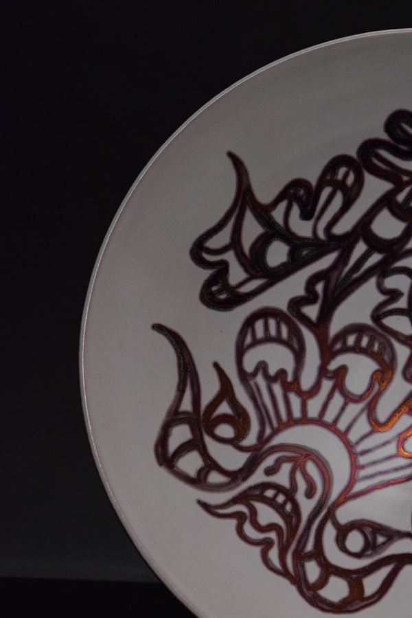 Grande ciotola in ceramica policroma a fondo chiaro con motivi informali riflessati color rame, retro a lustro color rame.