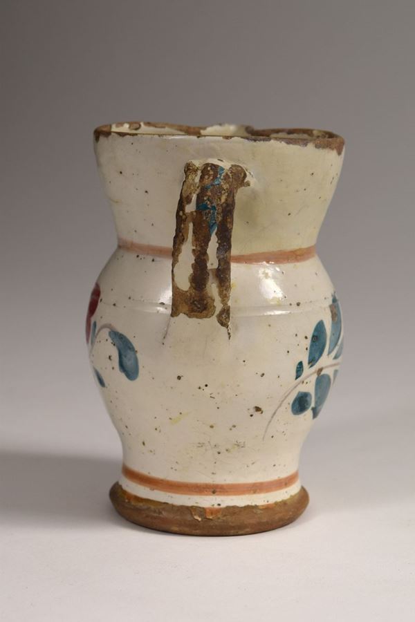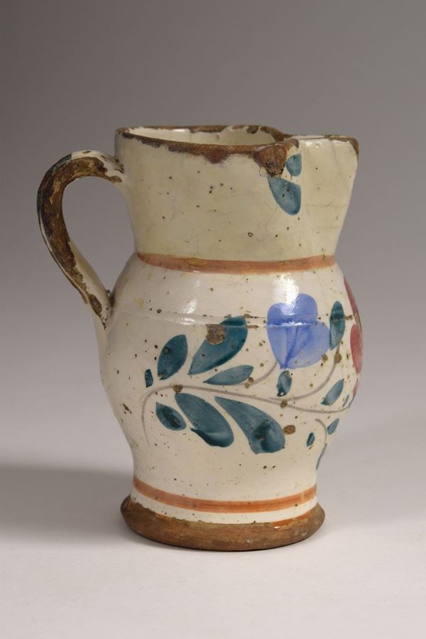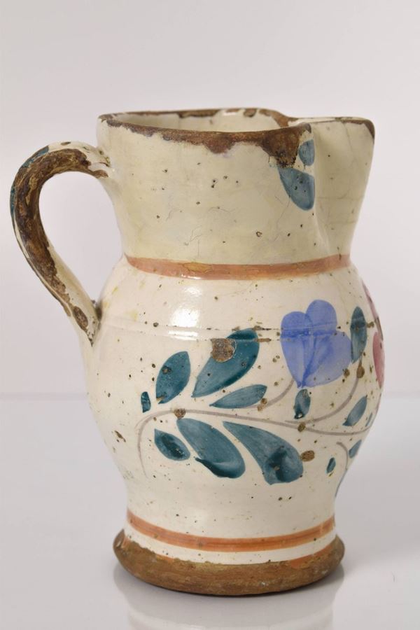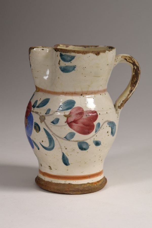 Boccale in maiolica policroma con bocca trilobata dipinto a fiori bordeaux e azzurri.