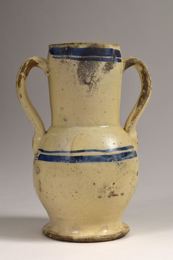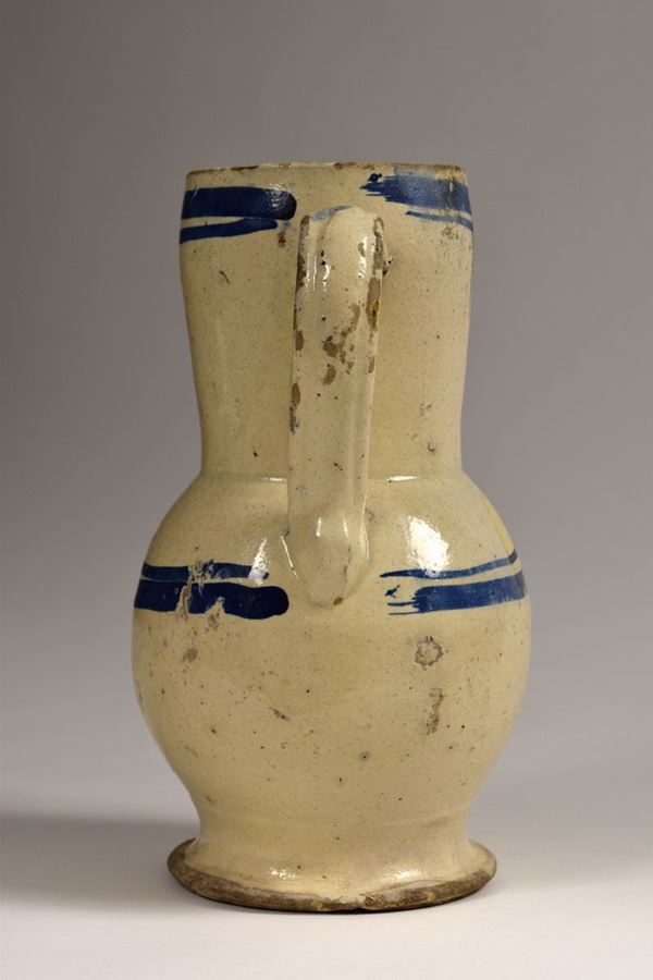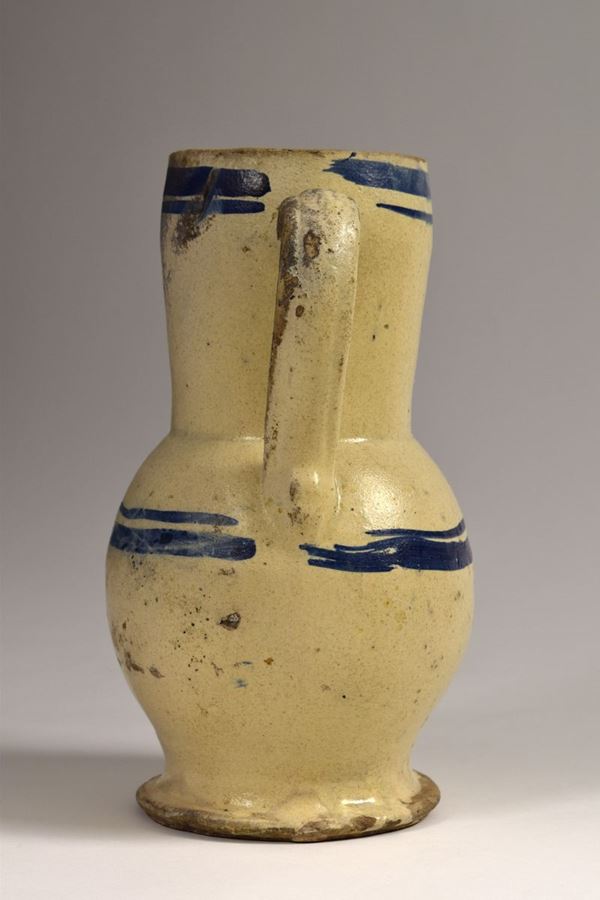 Brocca a due manici in maiolica decorata a righe blu a evidenziare bocca e corpo.