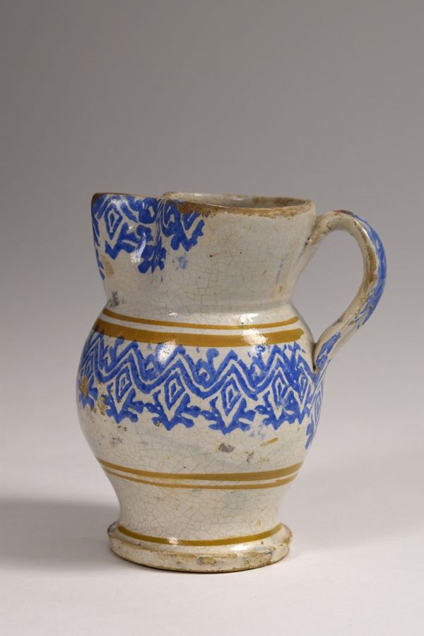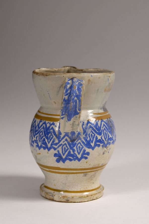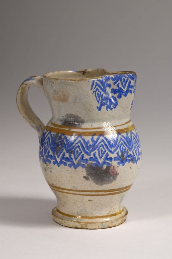 Piccola brocca in maiolica dipinta a bocca trilobata evidenziata da motivi a "spugna" azzurri. Corpo decorato a righe brune e decori a "spugna" azzurri.