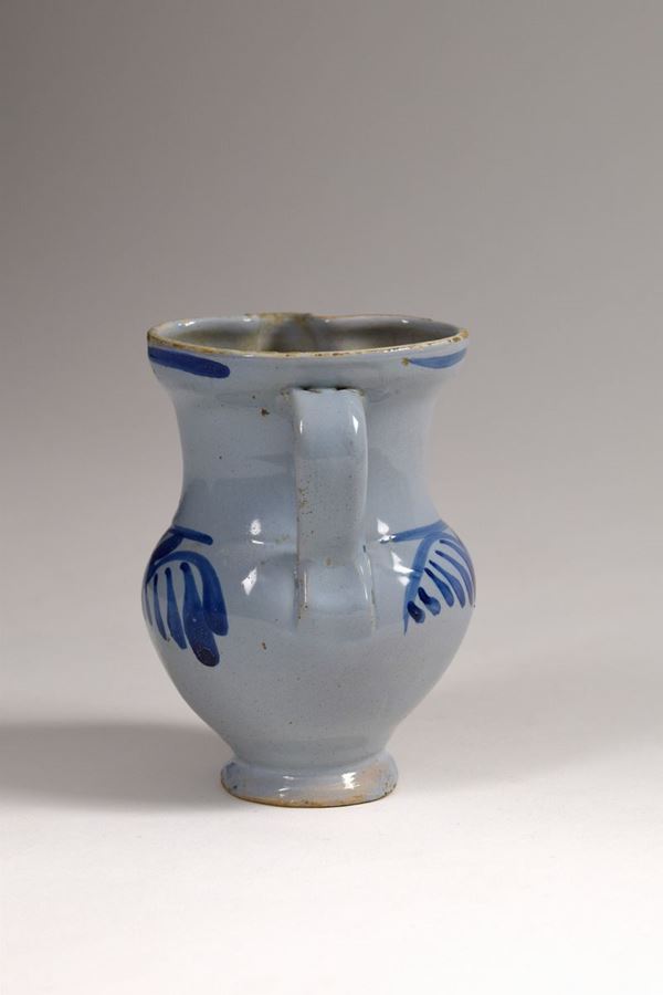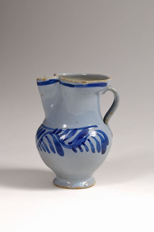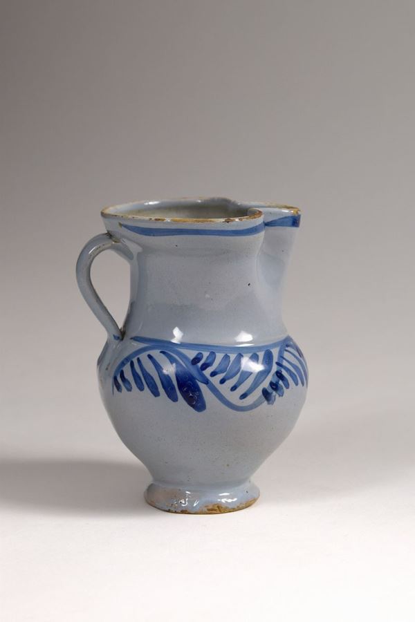Piccola brocca in maiolica dipinta a bocca trilobata evidenziata da riga blu, corpo a fondo grigio, la parte centrale è evidenziata da motivi a foglie in blu.