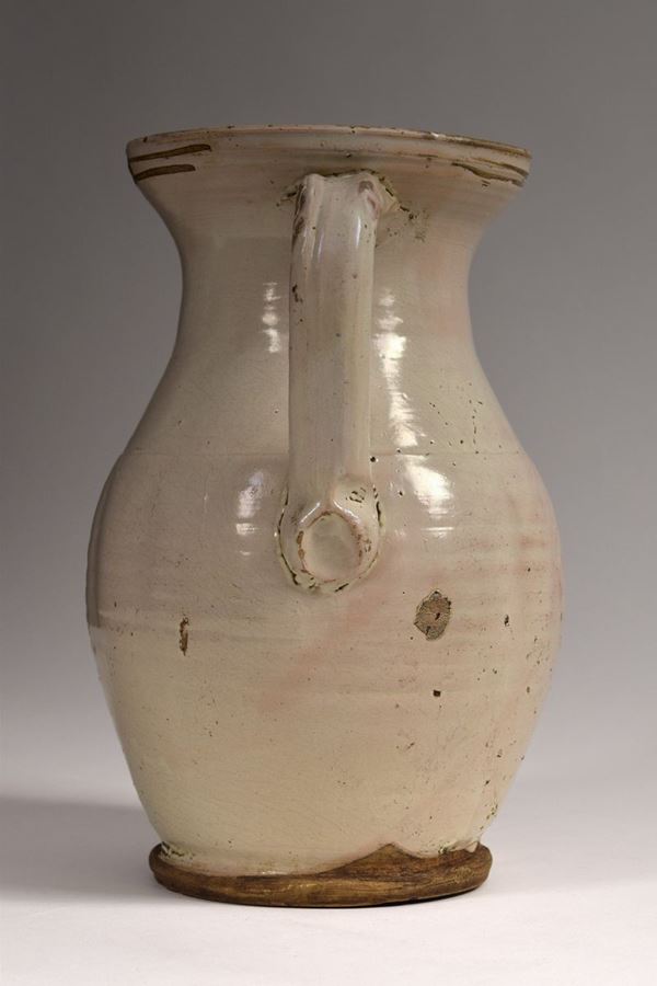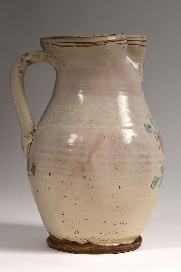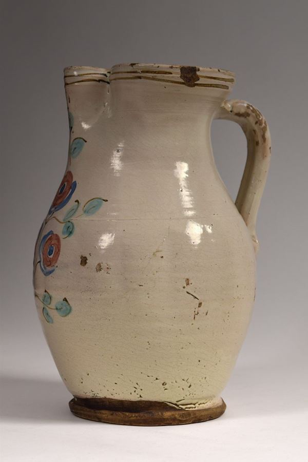 Grande brocca in maiolica policroma a bocca trilobata evidenziata da due righe in bruno, nella parte centrale decoro alla "rosa di Calitri".