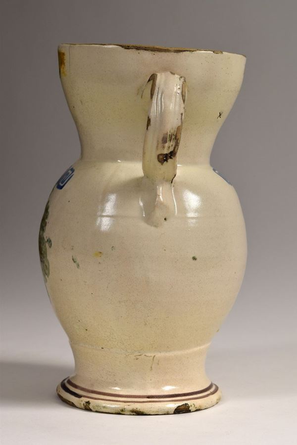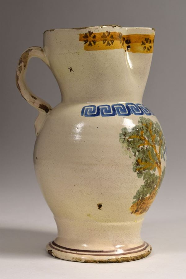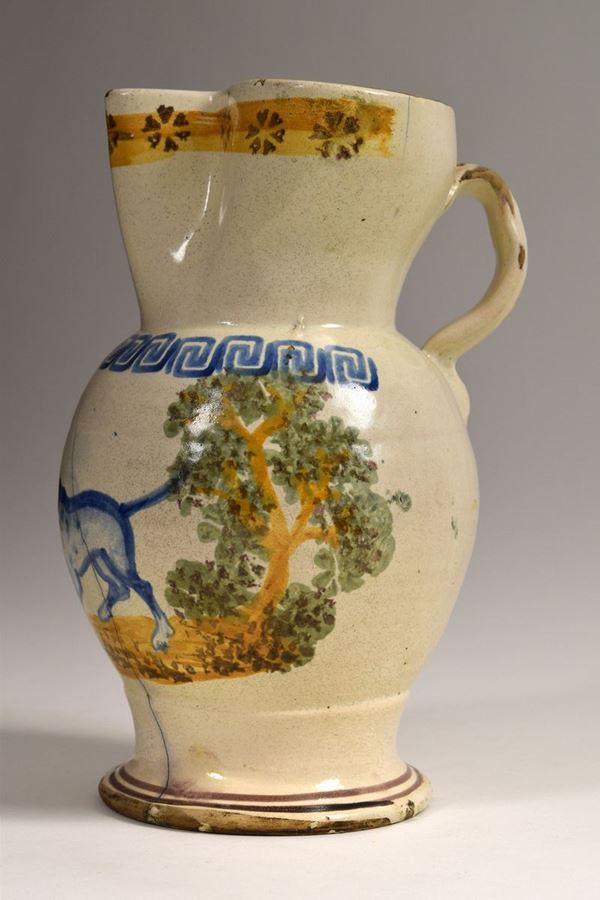 Brocca in maiolica policroma a bocca trilobata evidenziata da fiori a spugna color bruno su righe color ocra. Corpo decorato con grande cane da caccia e alberi e greca blu.
