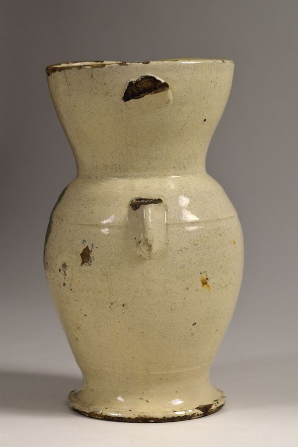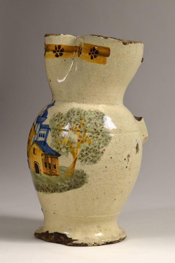 Brocca in maiolica policroma a bocca trilobata evidenziata da fiori a "spugna" bruni su righe ocra. Corpo decorato con case tra alberi.