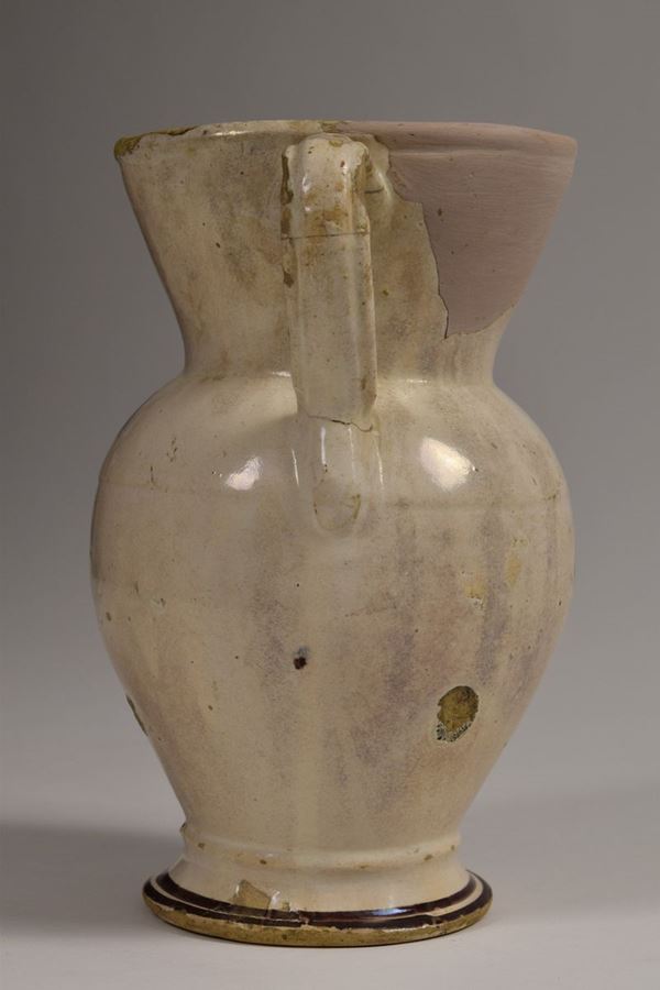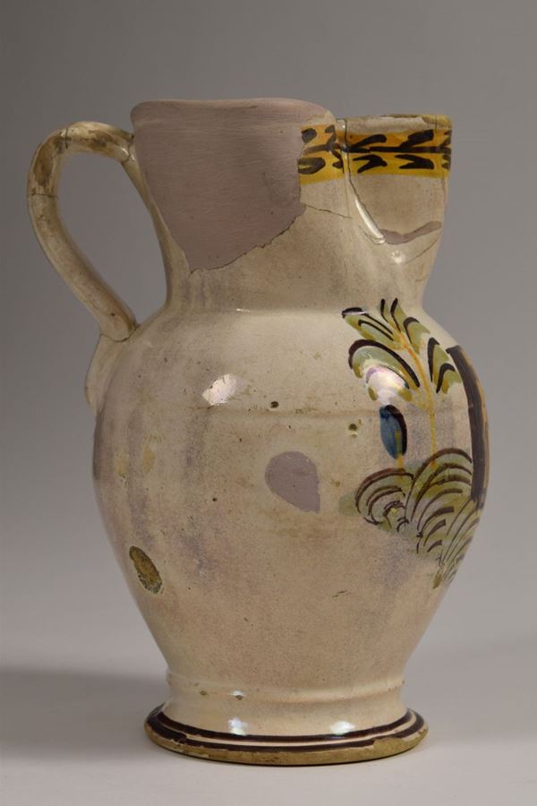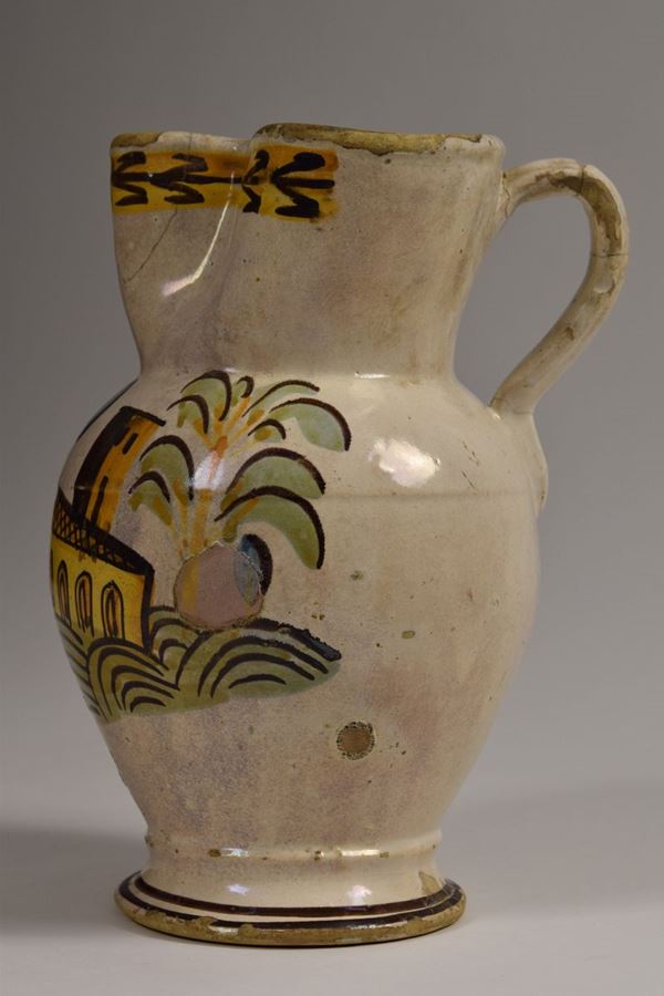 Brocca in maiolica policroma a bocca trilobata evidenziata da motivi bruni su righe ocra. Corpo decorato con grande maniero tra palme.