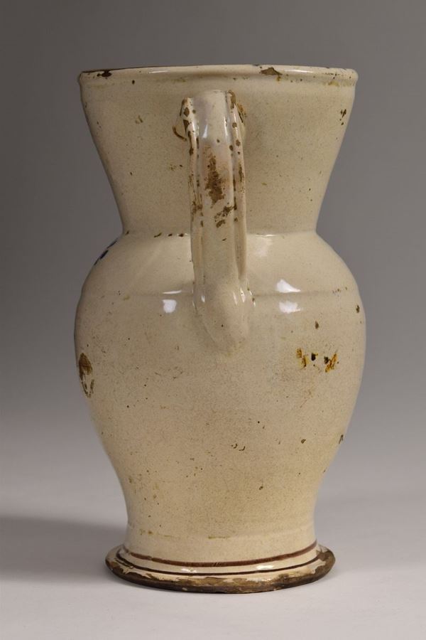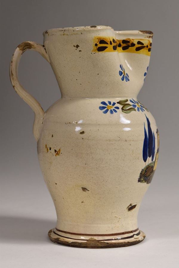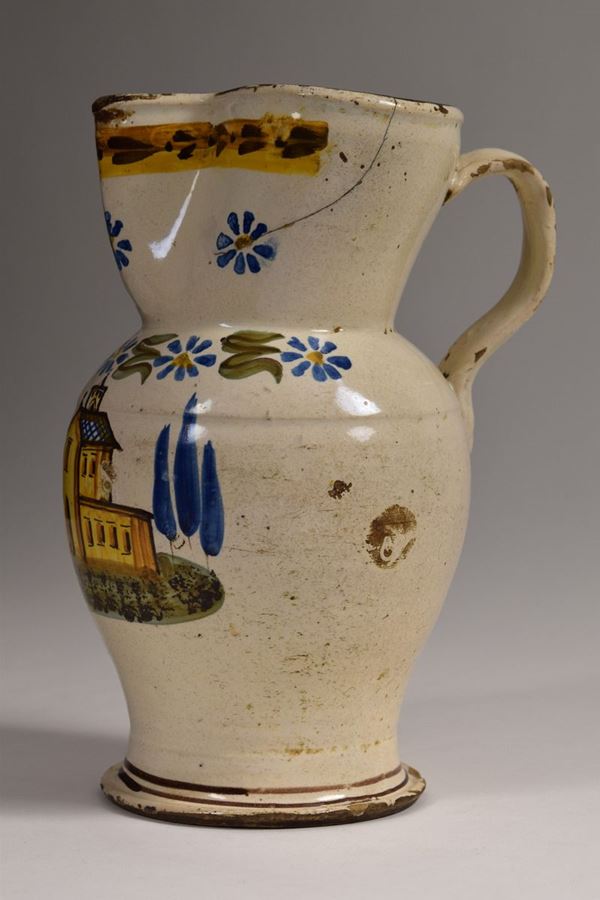 Brocca in maiolica policroma a bocca trilobata evidenziata da foglie di colore bruno su righe ocra. Corpo decorato con convento tra alberi e fiori a "spugna" e motivi vegetali.