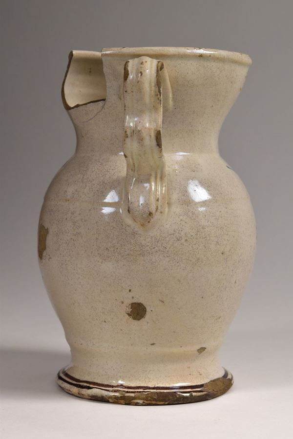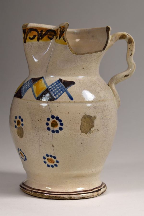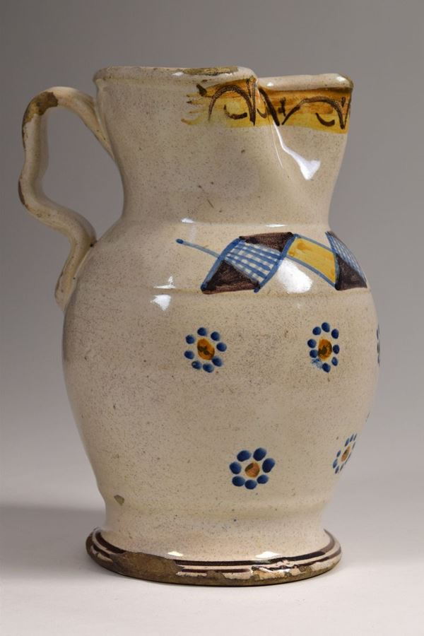 Grande brocca in maiolica policroma dipinta, a bocca trilobata evidenziata da decori in bruno a fondo giallo ocra, corpo decorato a greca policroma e fiori a "spugna" blu e ocra.