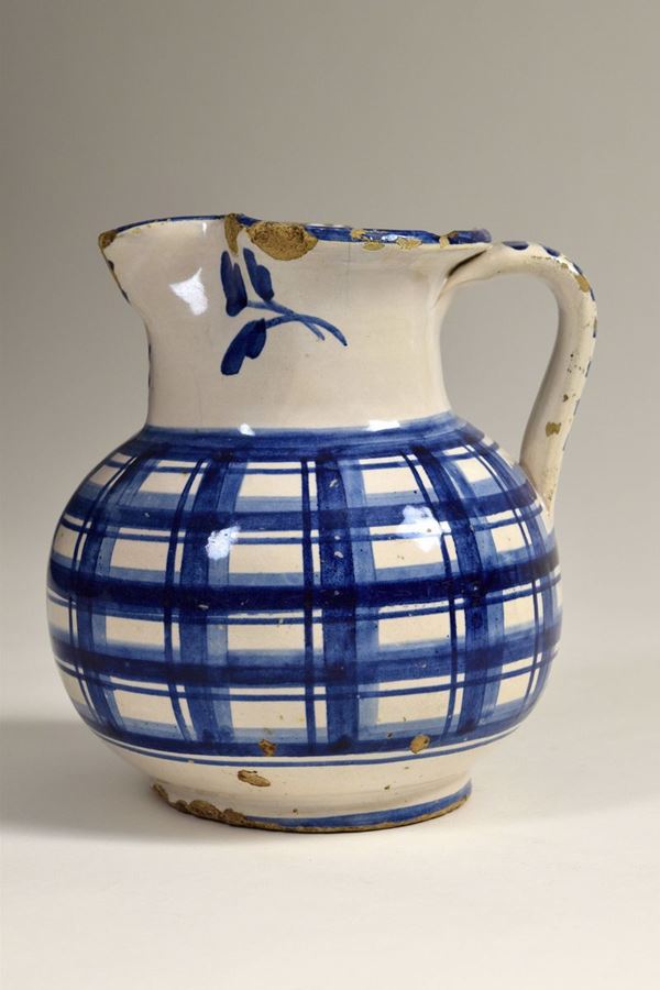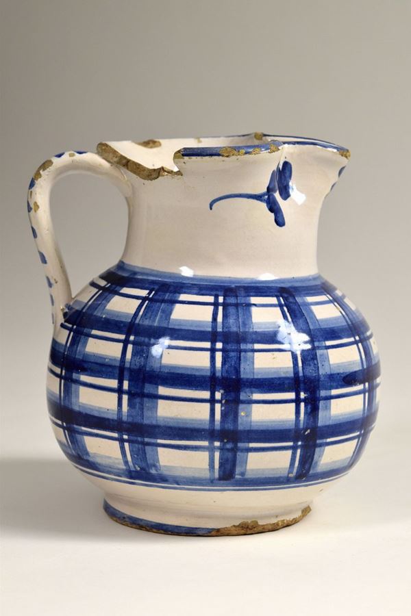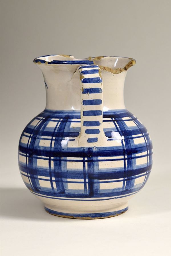 Brocca in maiolica policroma dipinta a quadri blu, bocca trilobata evidenziata da fiori.
