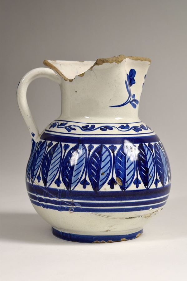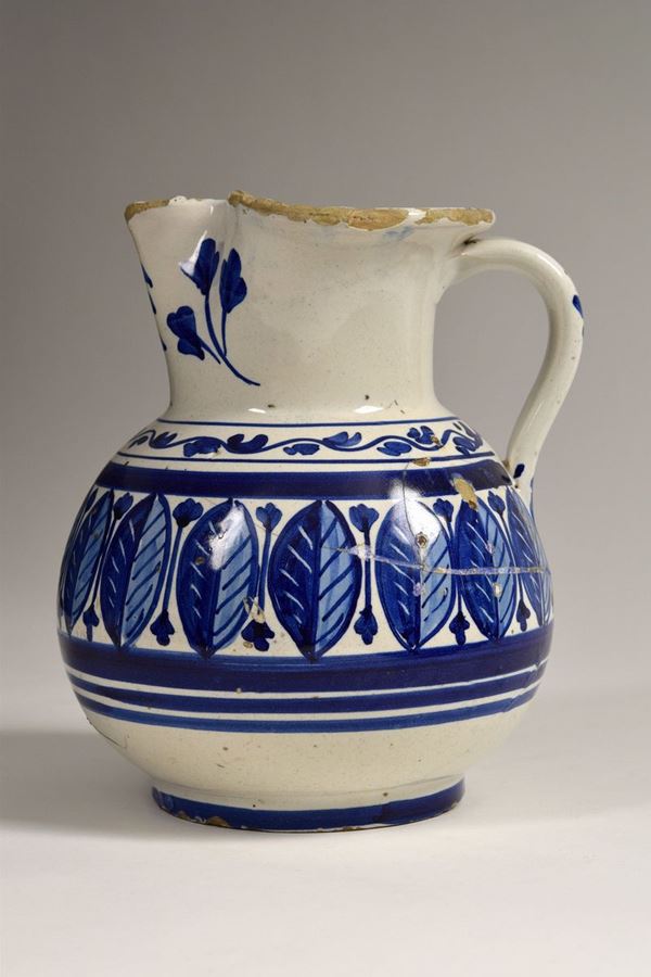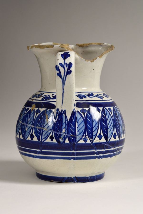 Brocca in maiolica policroma dipinta con foglie verticali e motivi geometrici, bocca trilobata evidenziata da foglie.