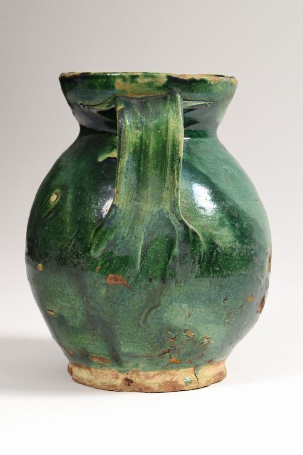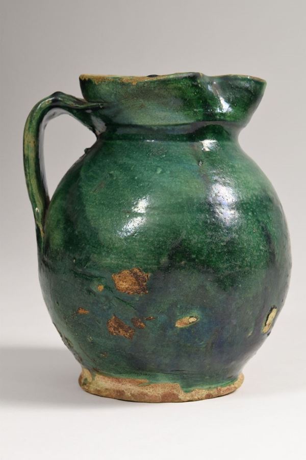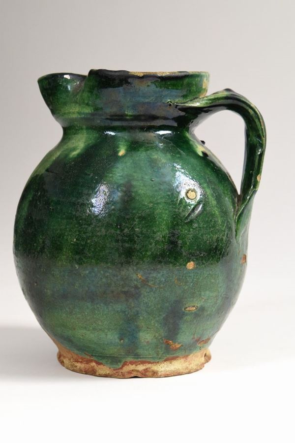 Brocca in terracotta interamente smaltata di verde a bocca trilobata con manico.