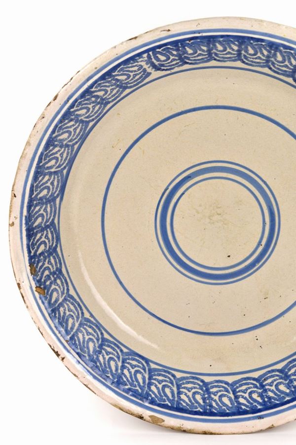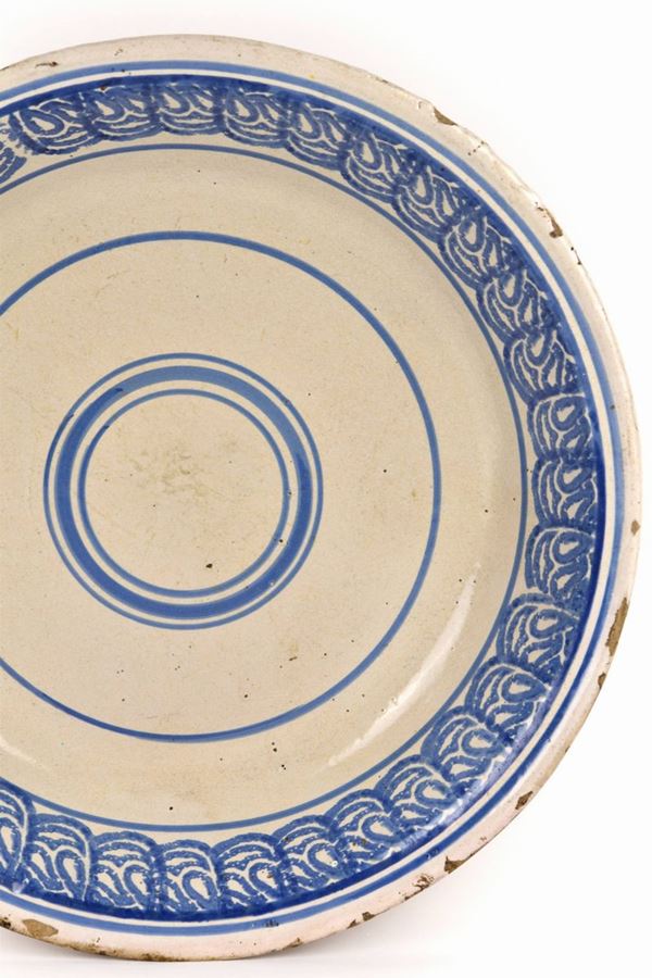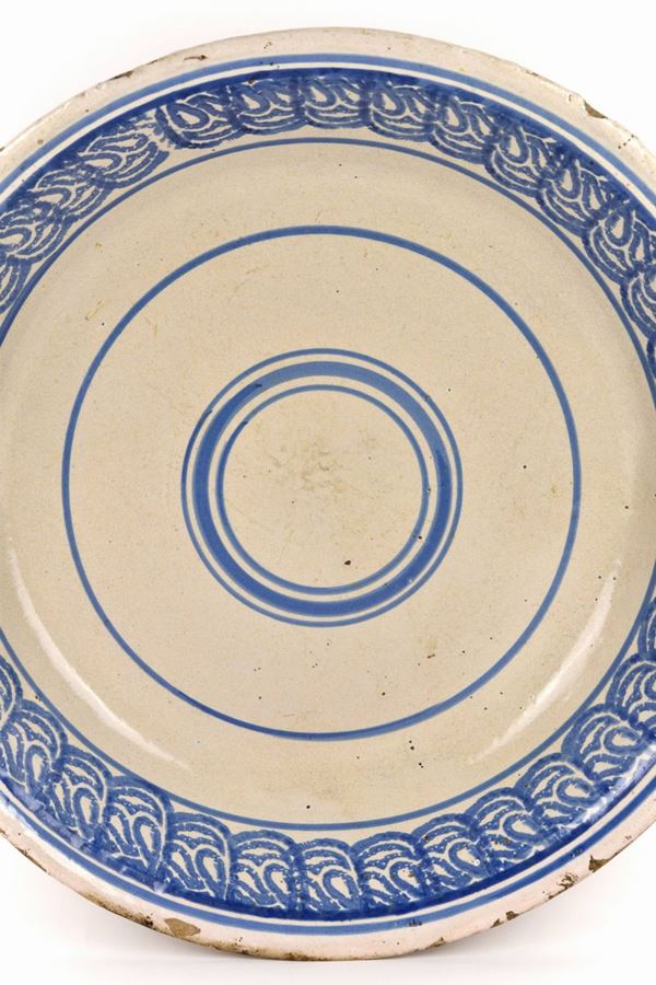 Catino in maiolica dipinta con righe blu sul fondo e bordo evidenziato da motivi a spugna.