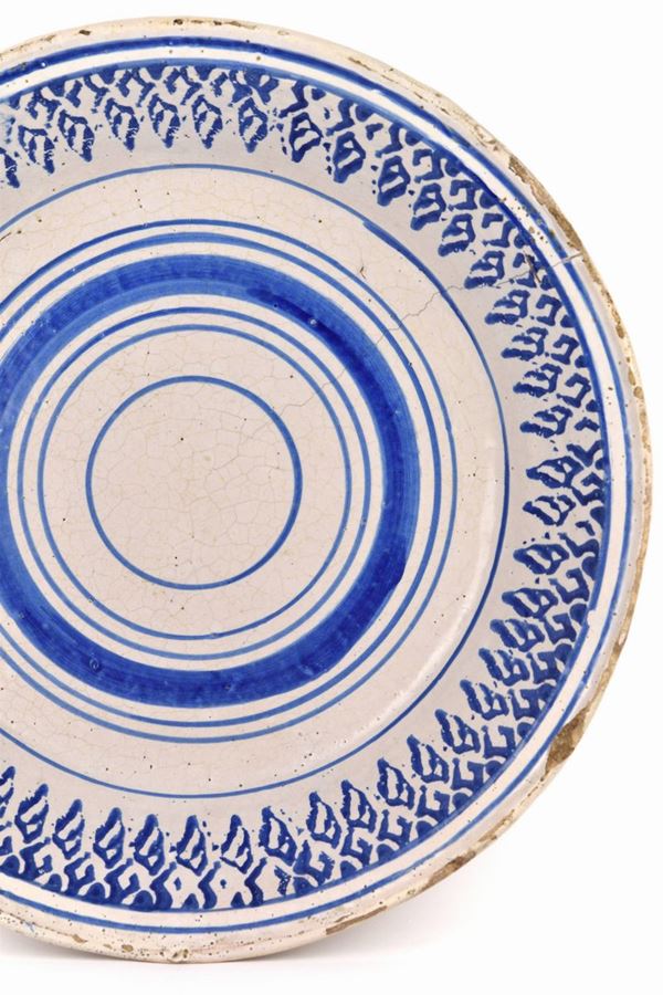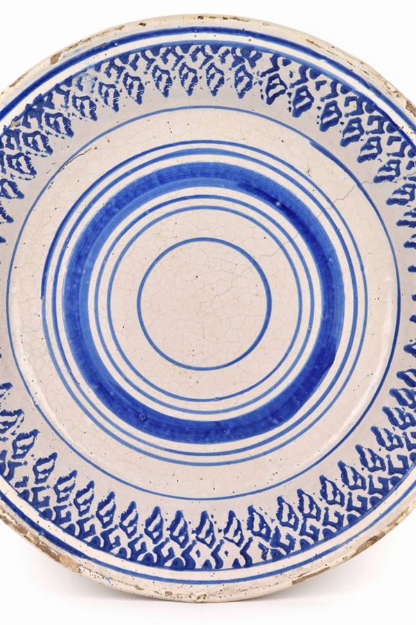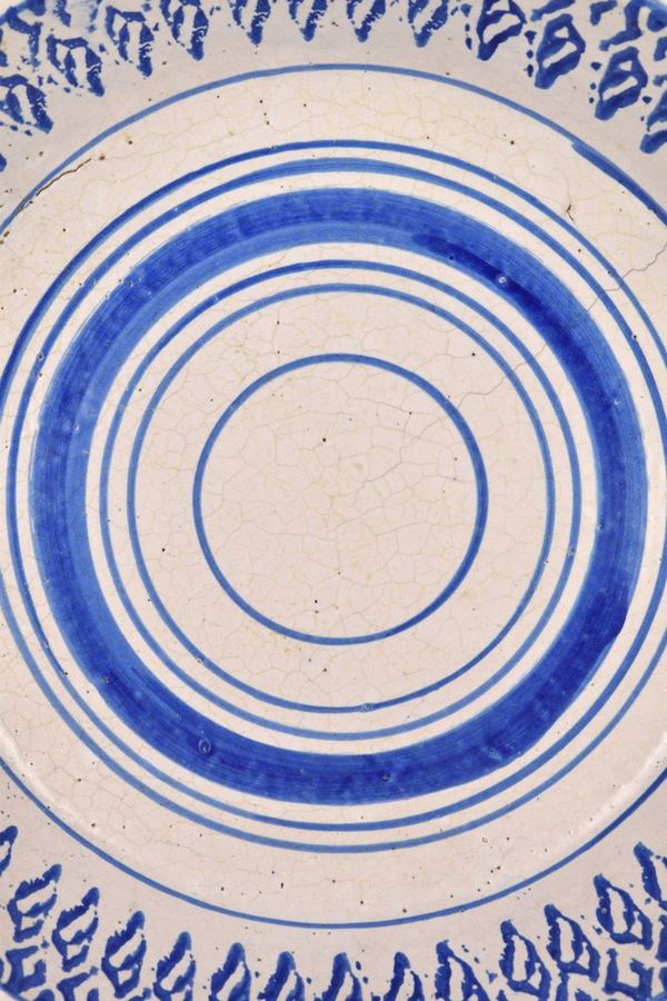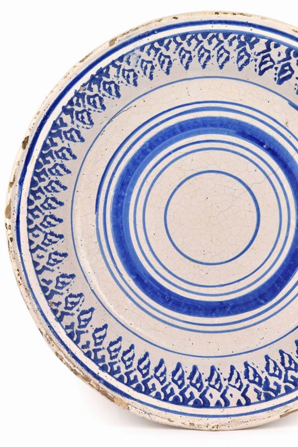 Catino in maiolica policroma decorato a righe blu al centro e bordo evidenziato da motivi a stampo.