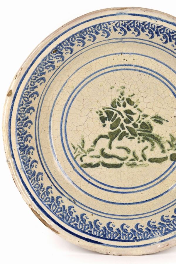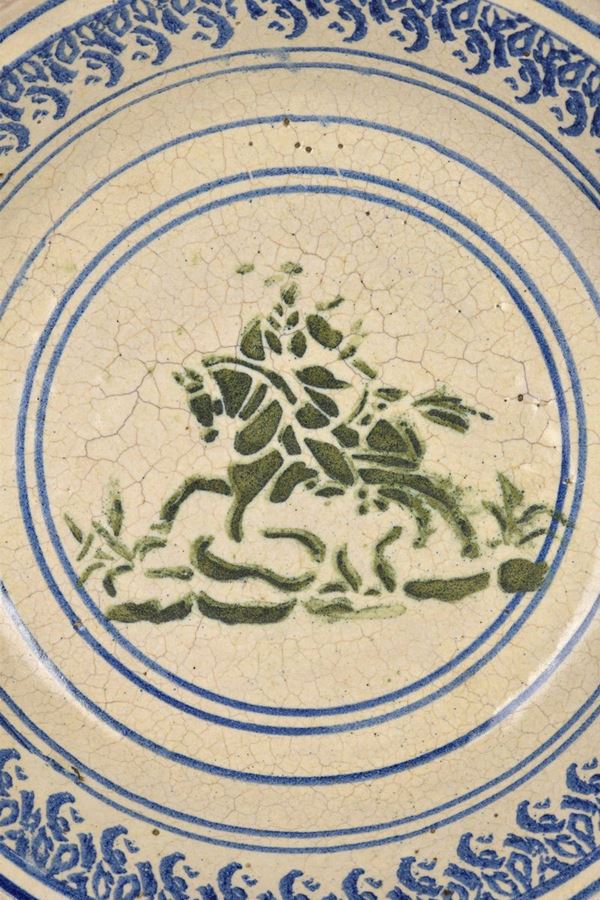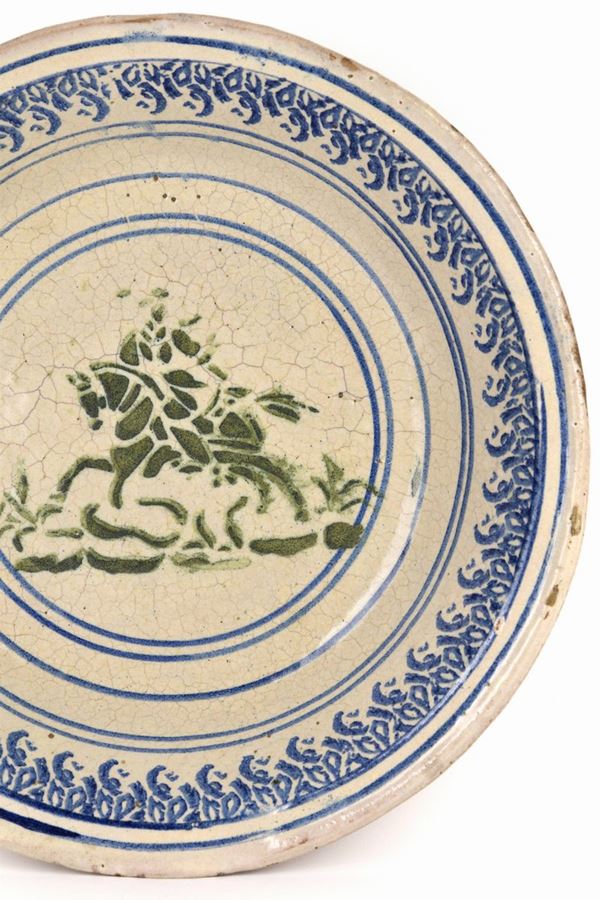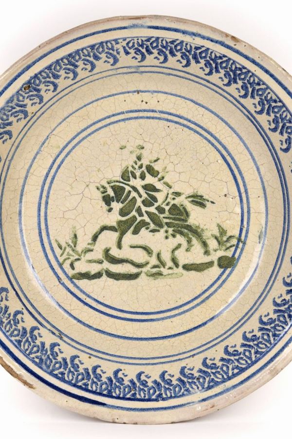 Grande catino in maiolica policroma decorato con cavaliere in verde a "stampino" al centro, decori a spugna in blu lungo il bordo.