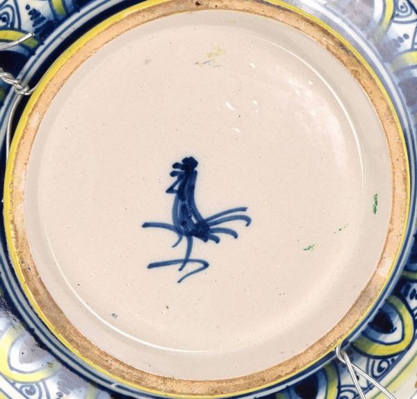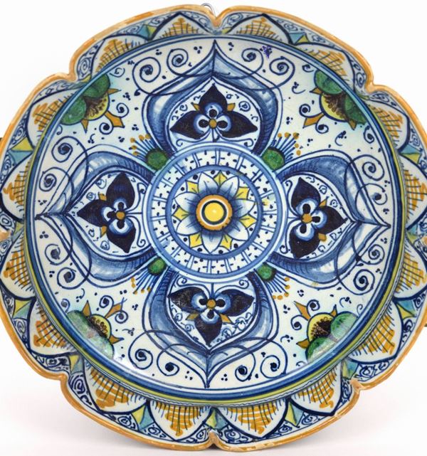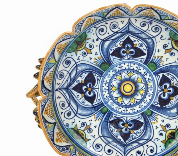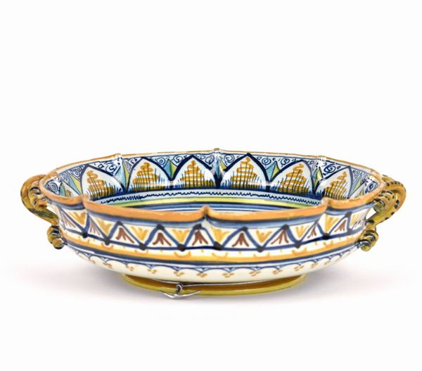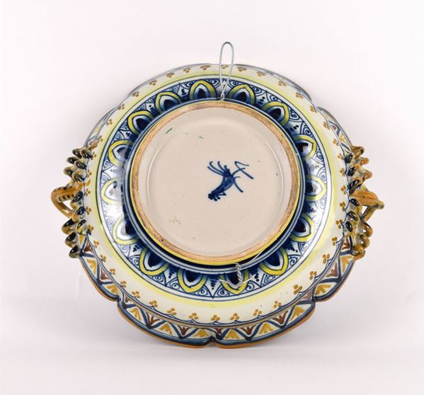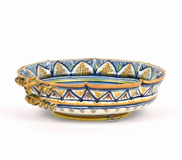 Centrotavola in maiolica policroma dipinta a motivi classici, bordo modanato e due piccoli manici a serpente, marcato sotto la base.