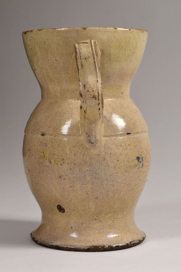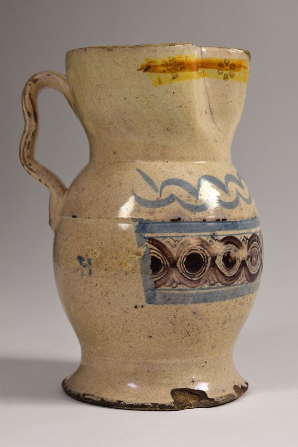 Brocca in maiolica policroma dipinta a bocca trilobata evidenziata da fiori a "spugna" bruni e righe color ocra. Corpo decorato a onde azzurre e motivi geometrici nei toni del marrone.