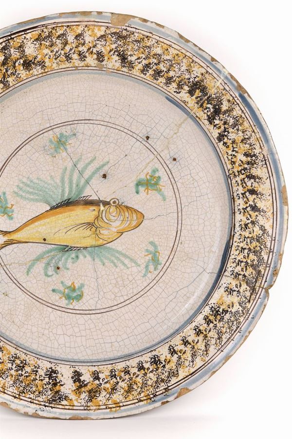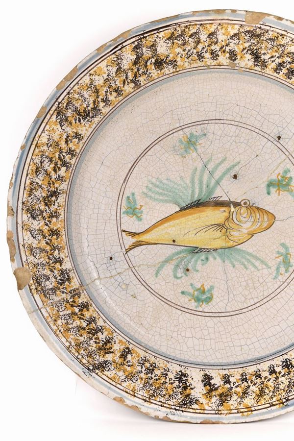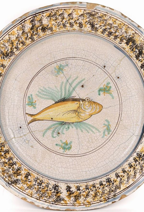 Grande piatto in maiolica policroma con pesce dipinto al centro e motivi a "spugna" lungo la tesa nei colori del bruno e giallo ocra.