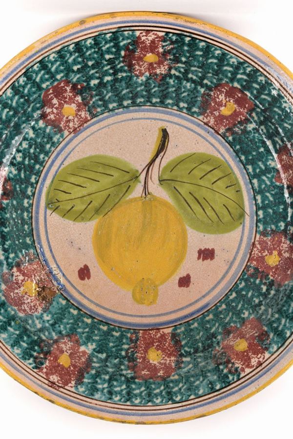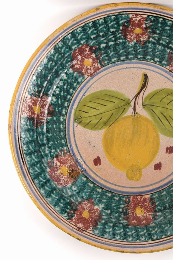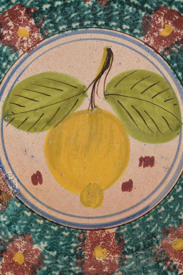 Grande piatto in maiolica dipinta con al centro limone e tesa decorata in verde e fiori a "spugna" rossi.