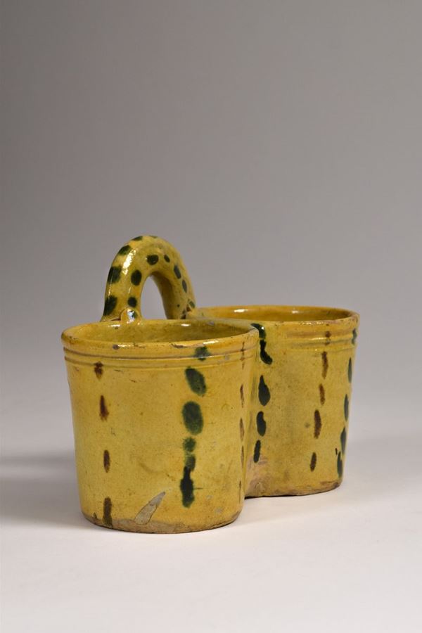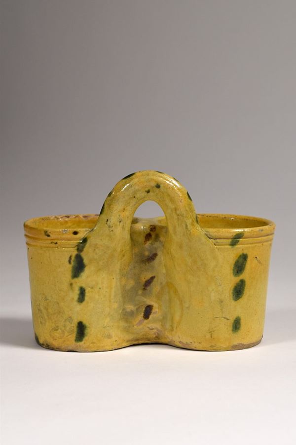 Porta oliere in maiolica policroma decorata punti verdi e bruni.