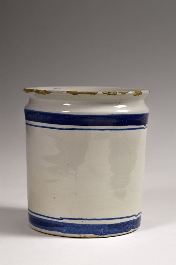 Vaso da grasso in maiolica smaltata bianco decorato a righe blu.