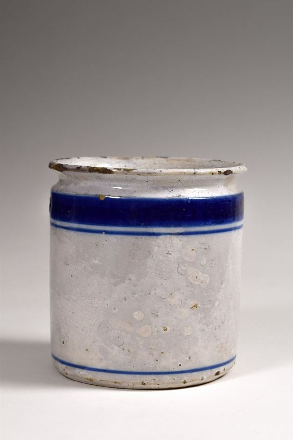 Vaso da grasso in maiolica smaltata bianca con righe blu.