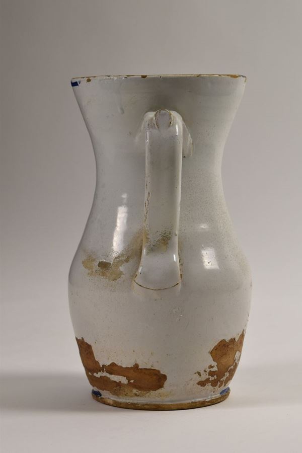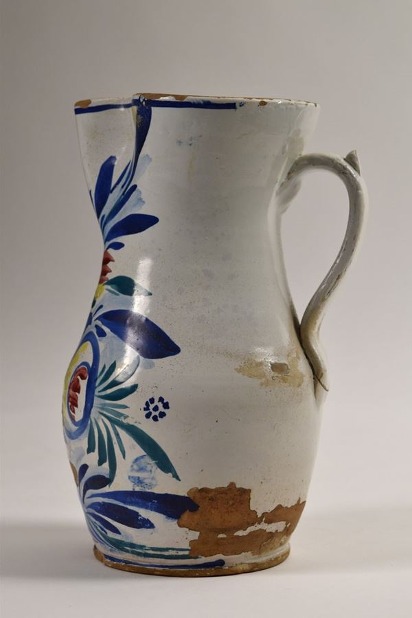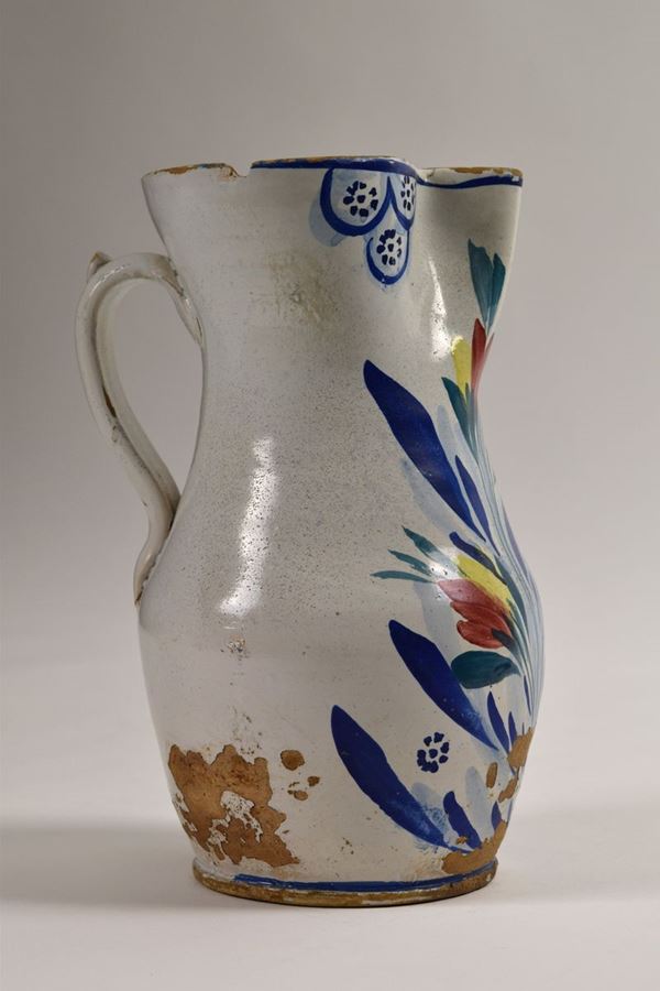 Brocca in maiolica policroma dipinta con bocca trilobata evidenziata da riga blu, corpo decorato a fiori policromi stilizzati.