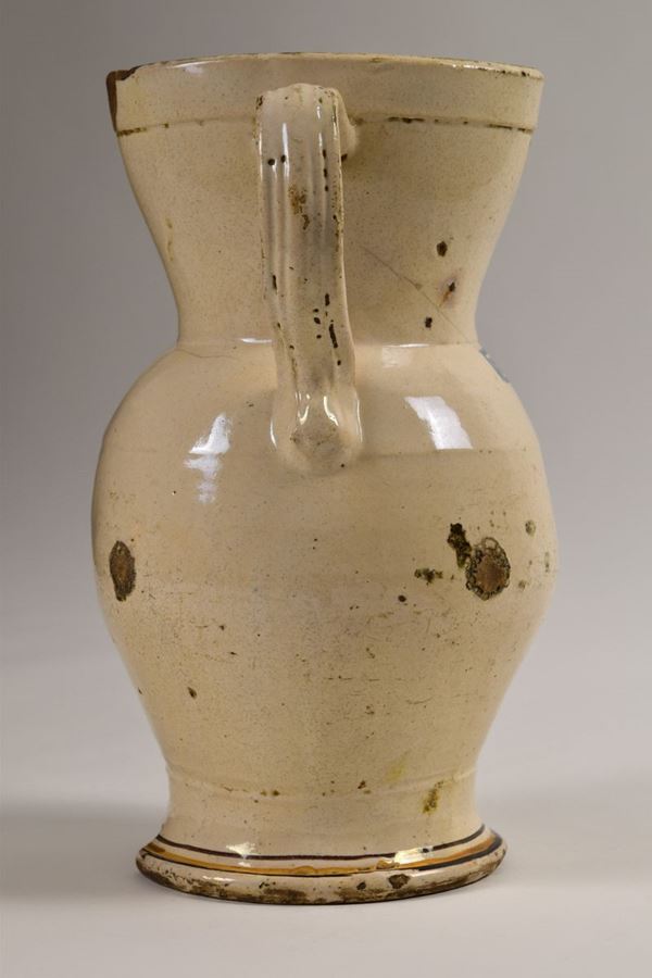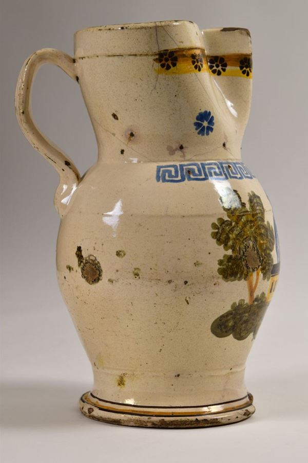 Brocca in ceramica policroma a bocca trilobata evidenziata da fiori a spugna e riga, corpo dipinto da greca e grande convento con alberi al centro.