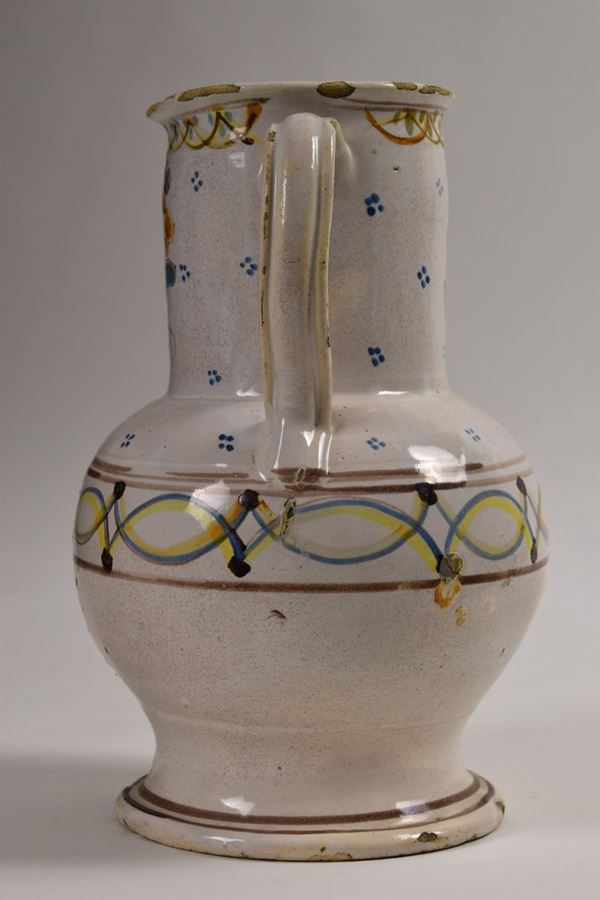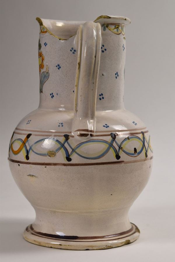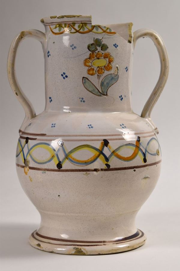 Brocca a due manici in ceramica policroma decorata con fiori e volute nel corpo e fiori a stampo blu.