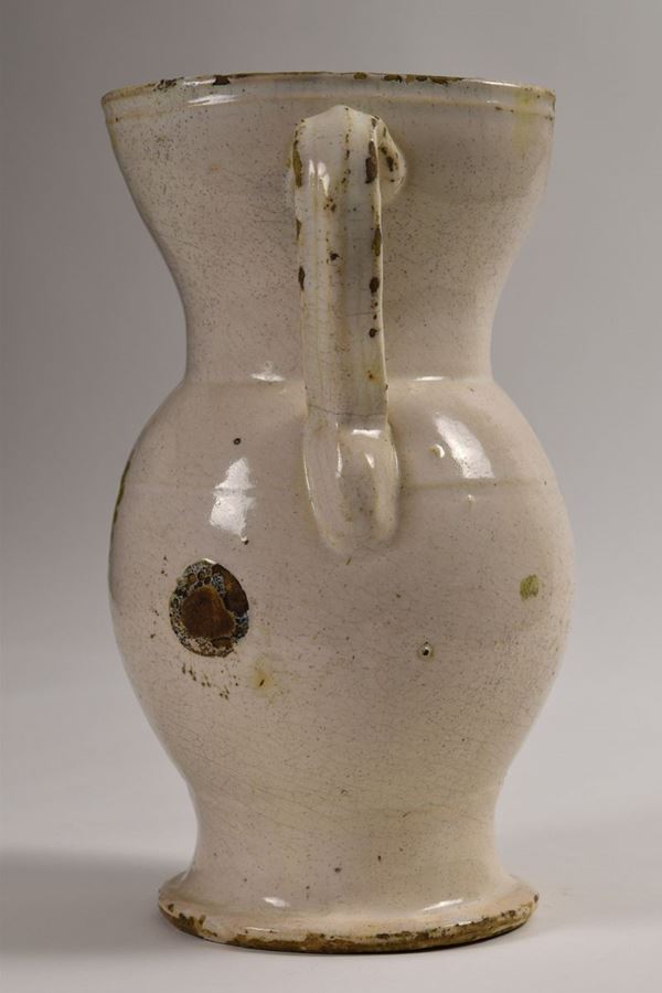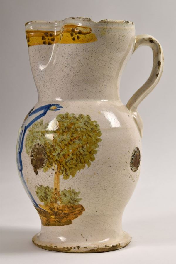 Brocca in maiolica policroma, bocca trilobata evidenziata da fiori bruni a spugna e riga gialla, corpo dipinto con grande pulcinella e alberi.
