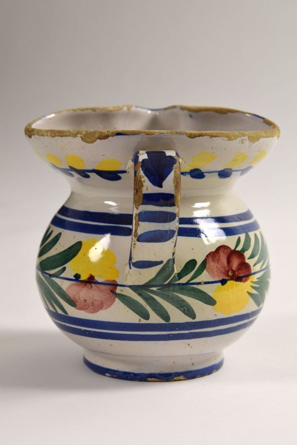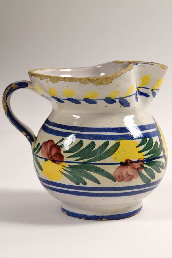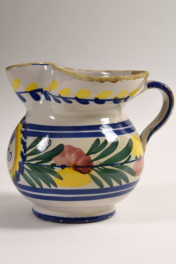 Brocca in ceramica policroma smaltata a bocca trilobata evidenziata da tralci di foglie. Nel fronte presenta la scritta "Bevi Amico", la rimanenza del corpo decorata a motivi floreali nei colori del rosso, verde, blu e giallo.
